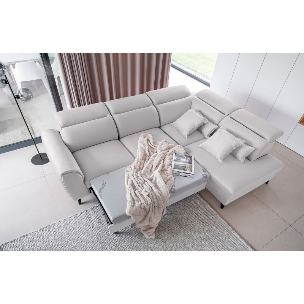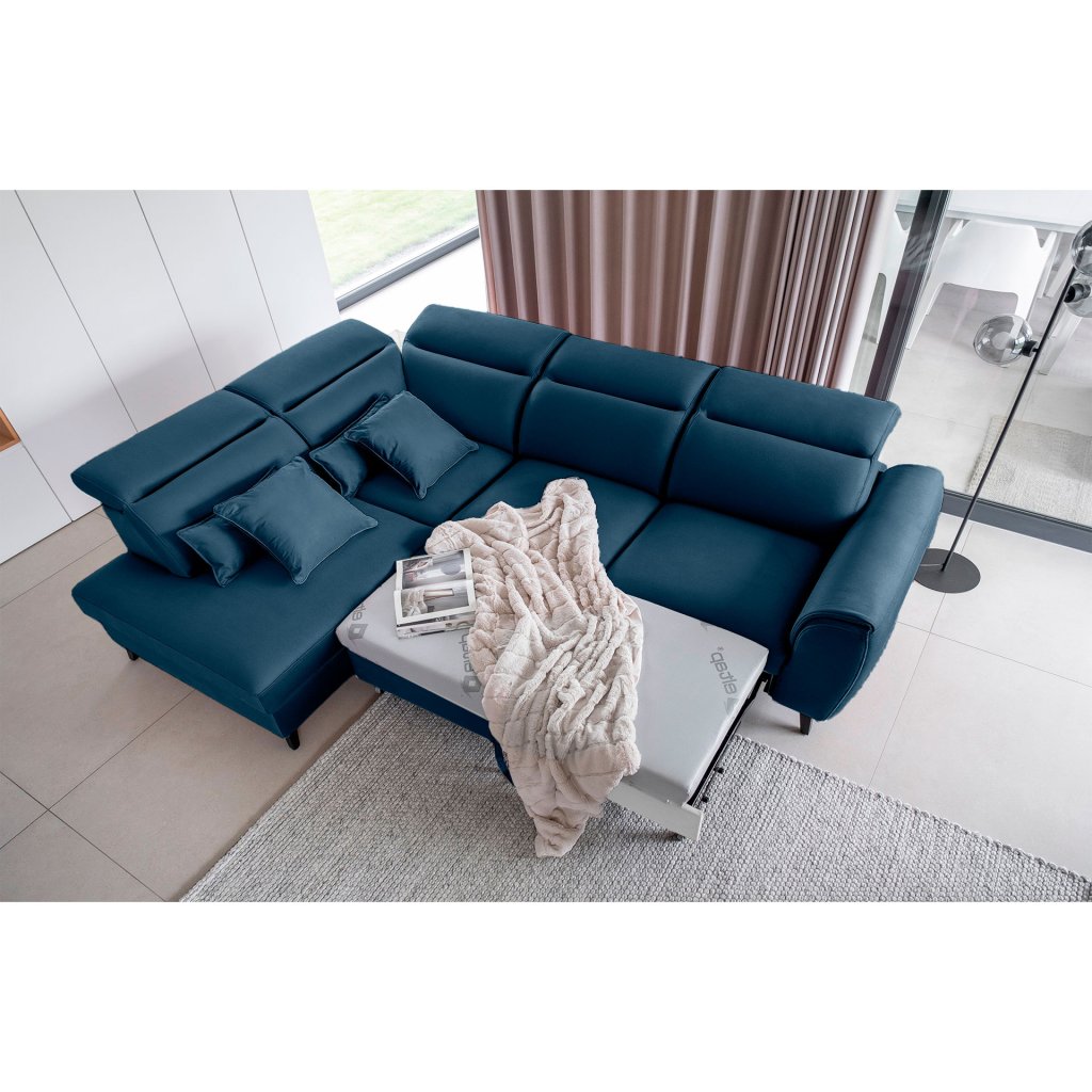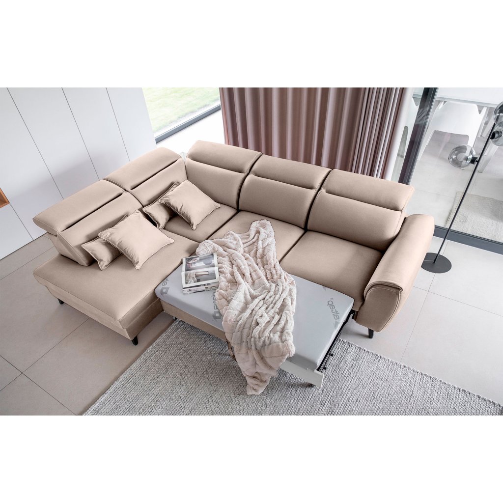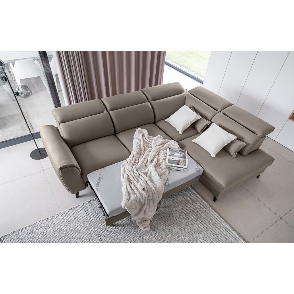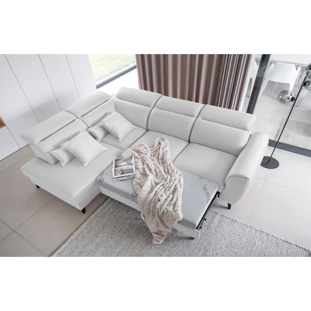 Nábytek může sloužit také jako lůžko o rozměrech 120x195 cm, protože je vybaven rozkládacím mechanismem typu delfín. Jeho předností je také výsuvné kolečko, které přispívá k většímu pohodlí z používání rohové sedací soupravy Noble.