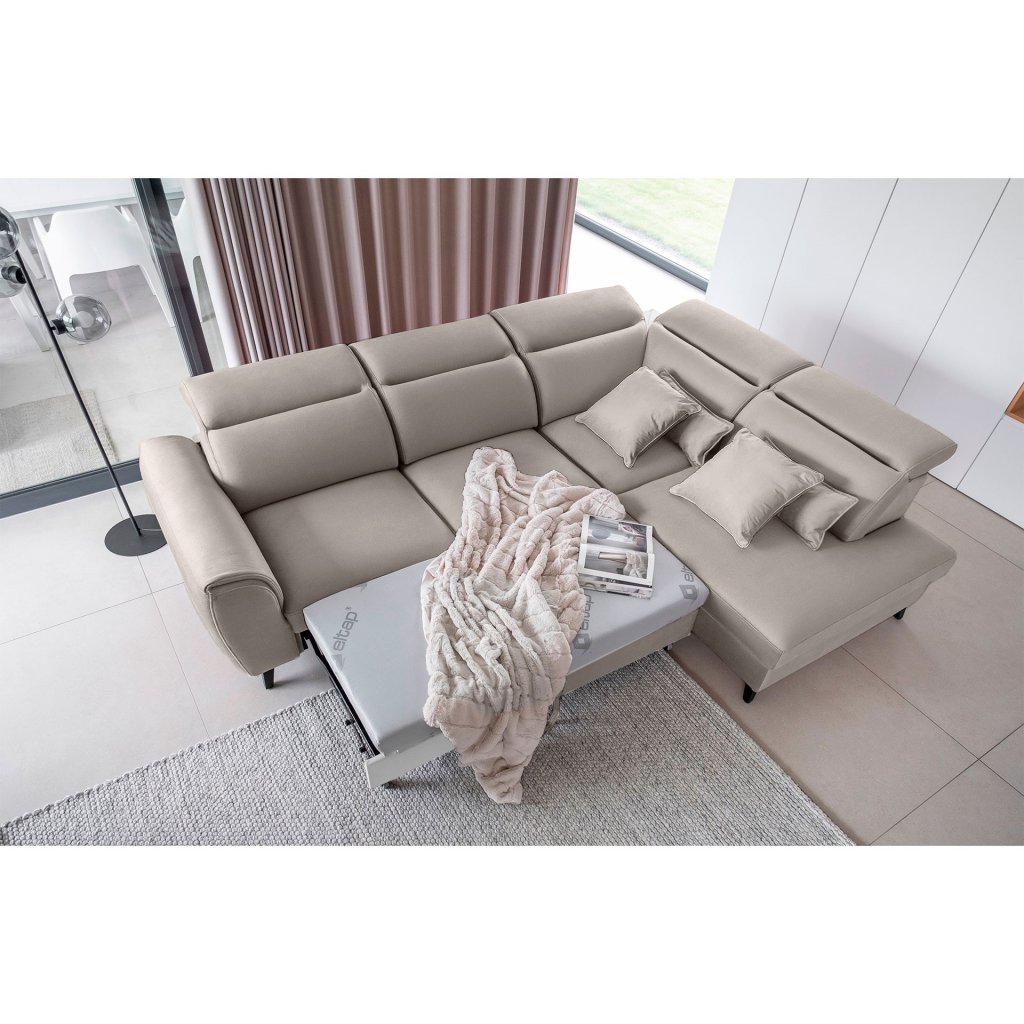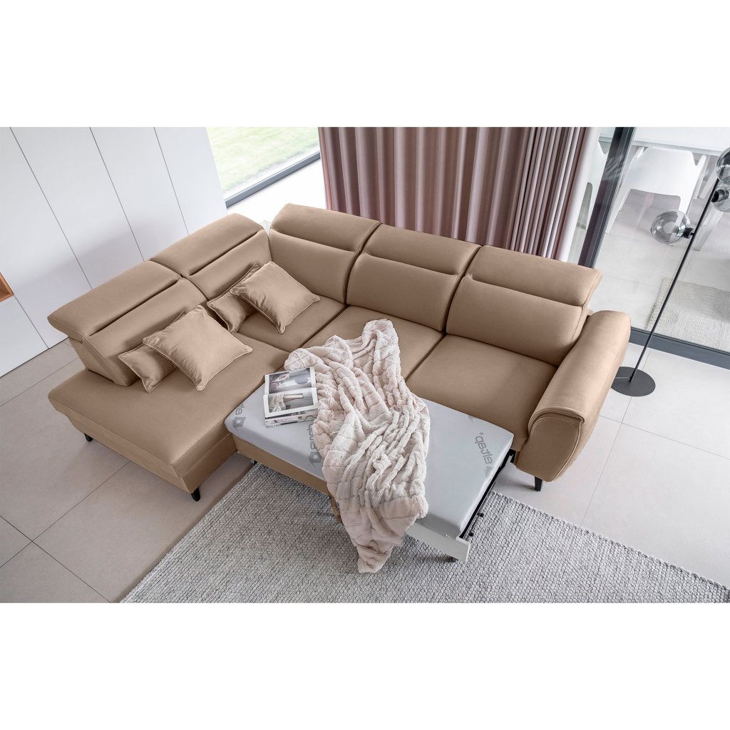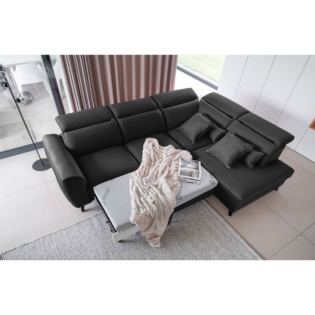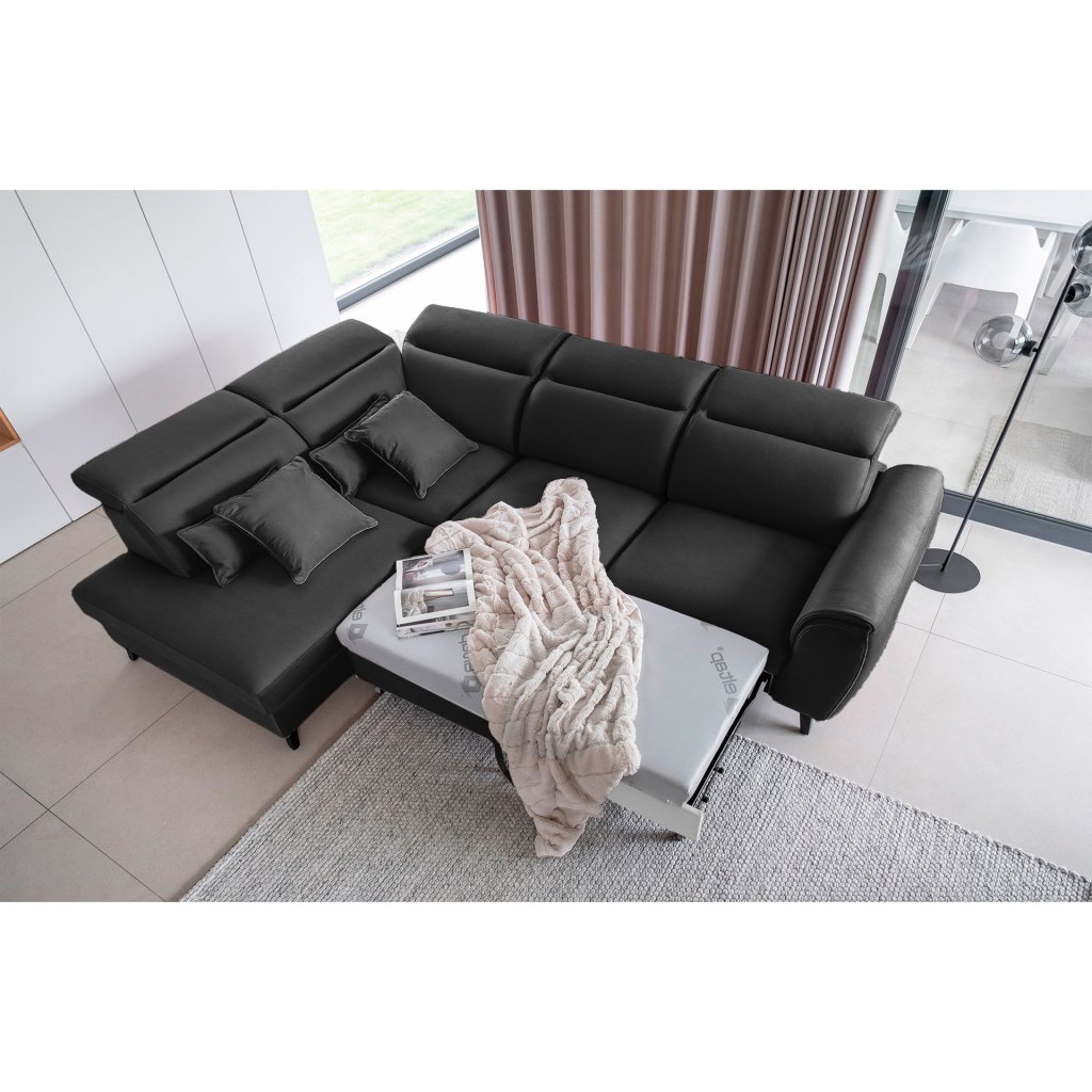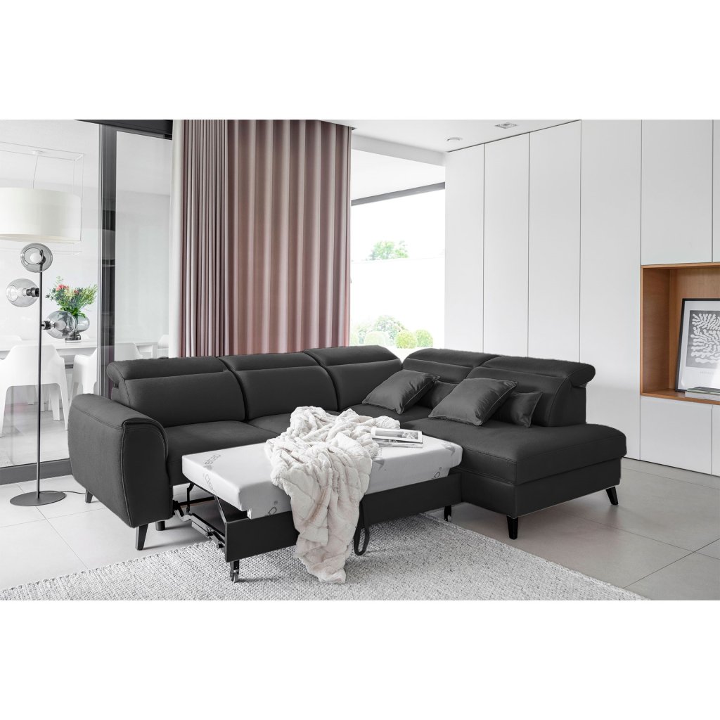 Nábytek může sloužit také jako lůžko o rozměrech 120x195 cm, protože je vybaven rozkládacím mechanismem typu delfín. Jeho předností je také výsuvné kolečko, které přispívá k většímu pohodlí z používání rohové sedací soupravy Noble.