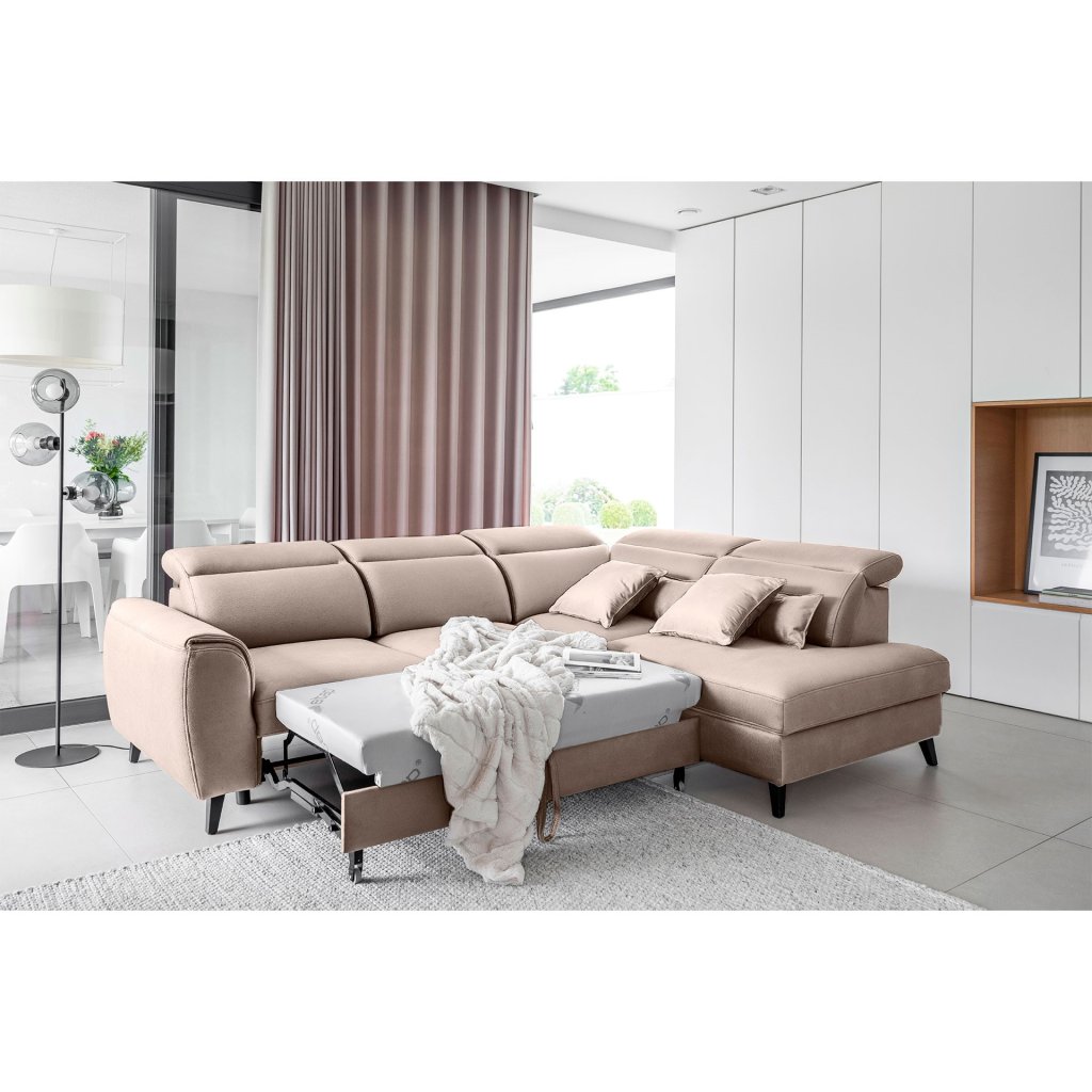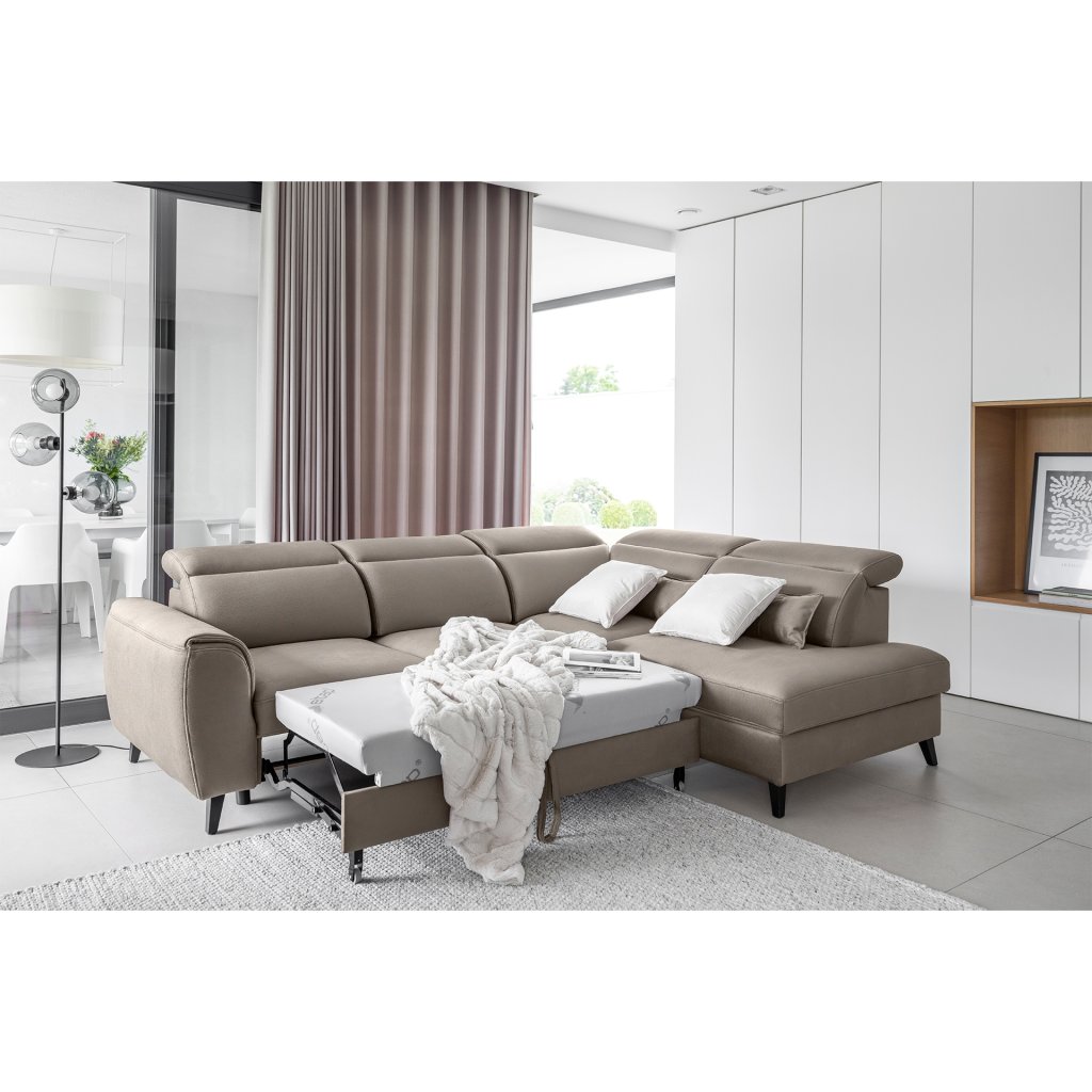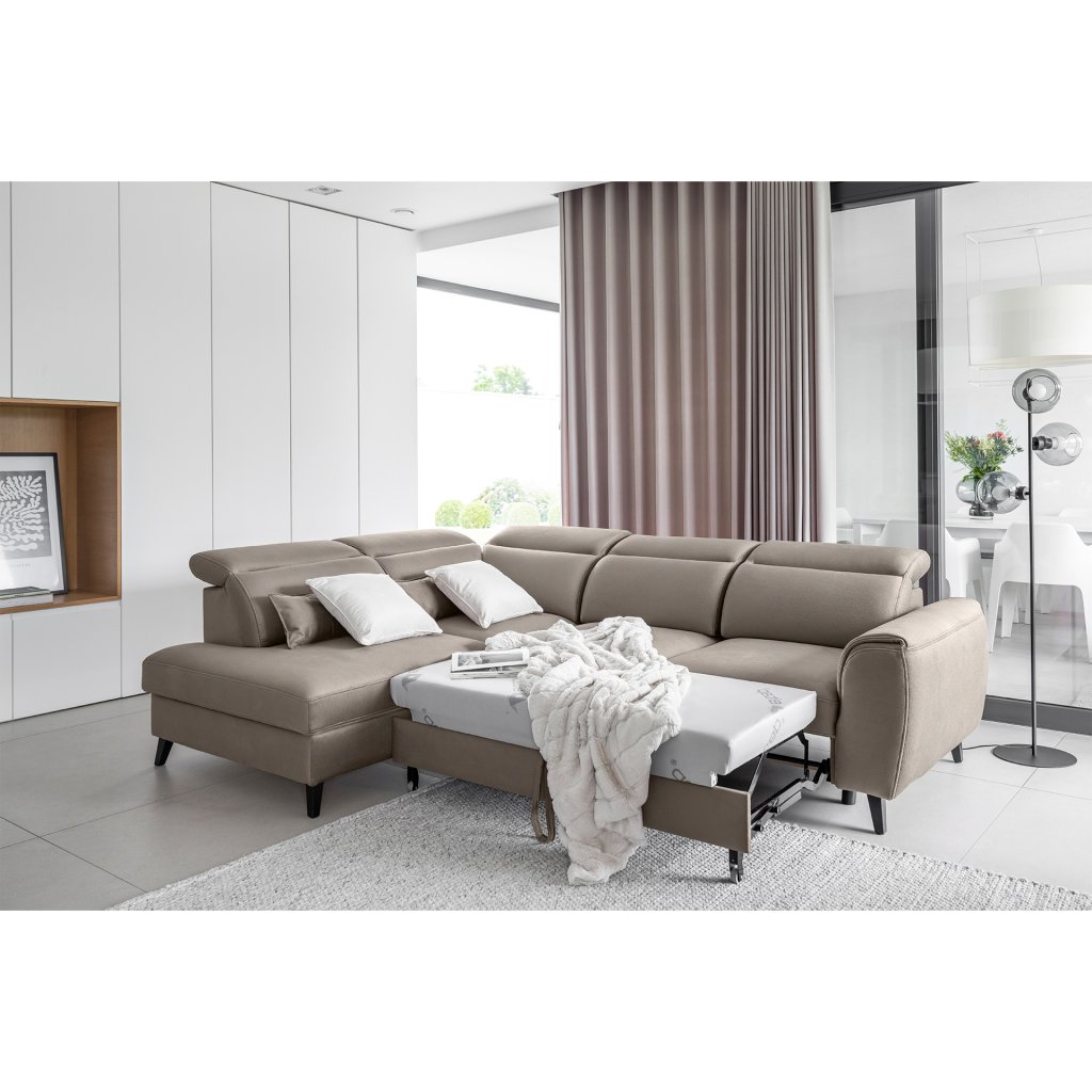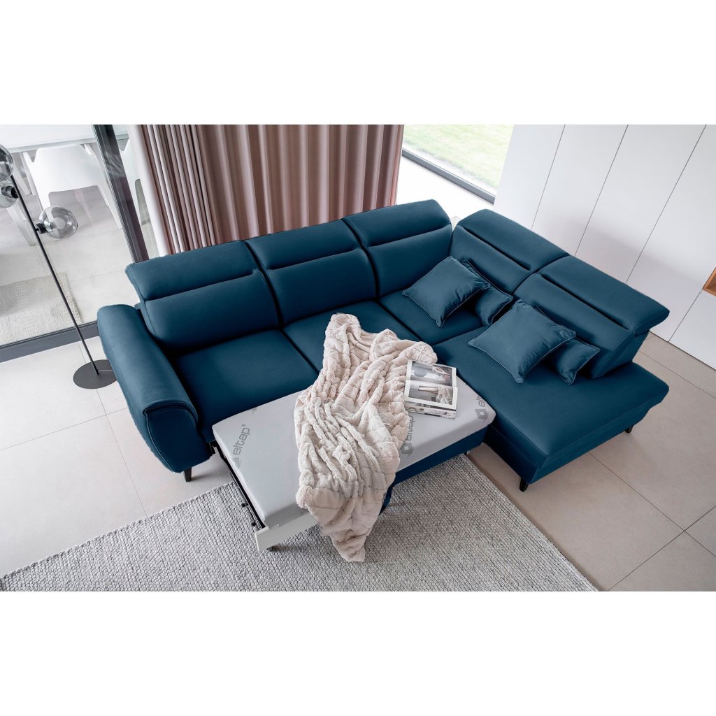 Nábytek může sloužit také jako lůžko o rozměrech 120x195 cm, protože je vybaven rozkládacím mechanismem typu delfín. Jeho předností je také výsuvné kolečko, které přispívá k většímu pohodlí z používání rohové sedací soupravy Noble.