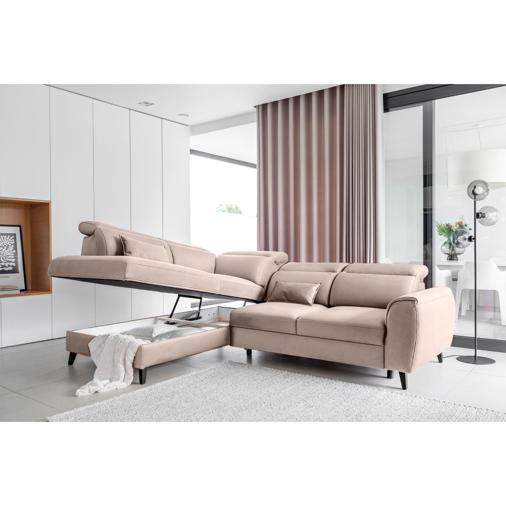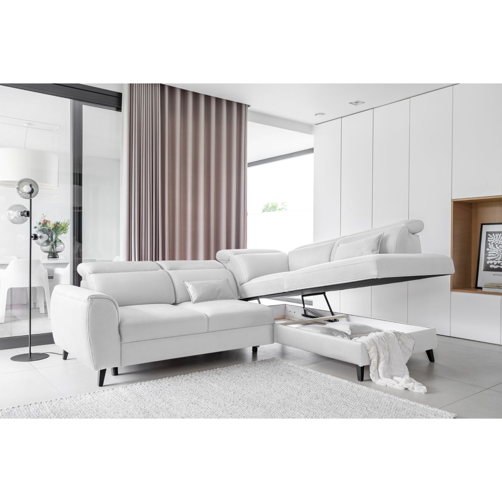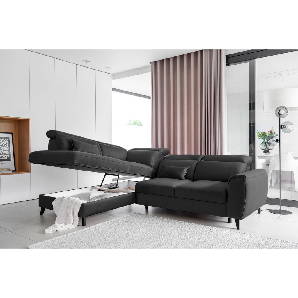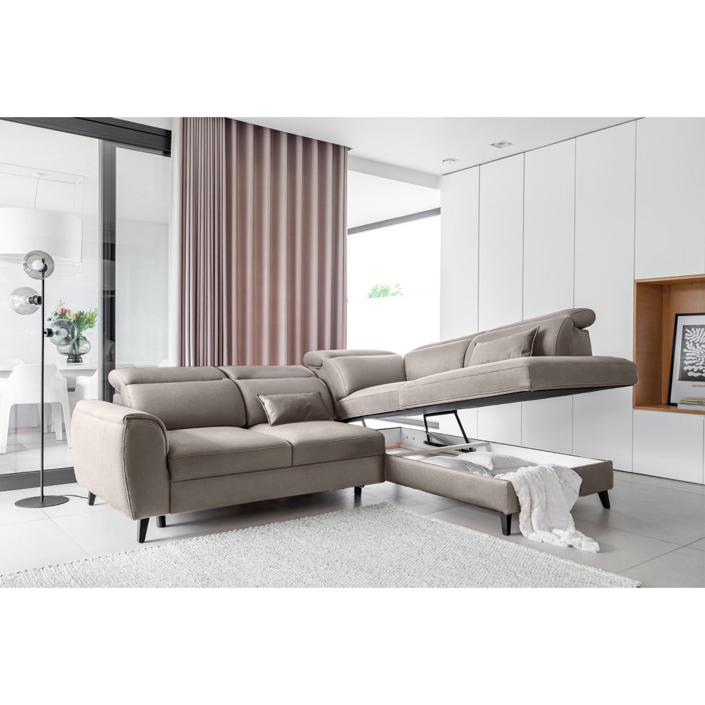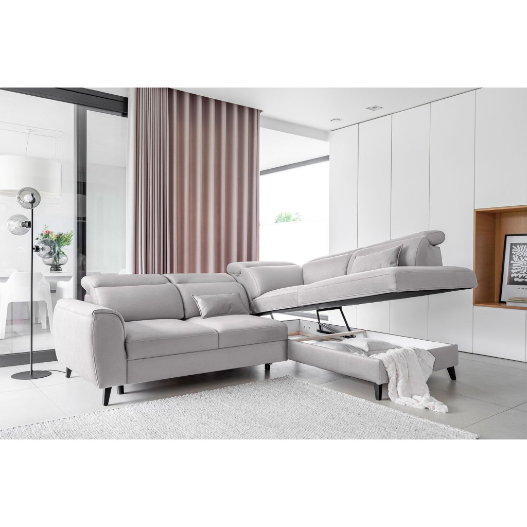 Tato rozkládací rohová sedací souprava má také kontejner na lůžkoviny. Skvělé místo pro uložení náhradních peřin nebo polštářů.