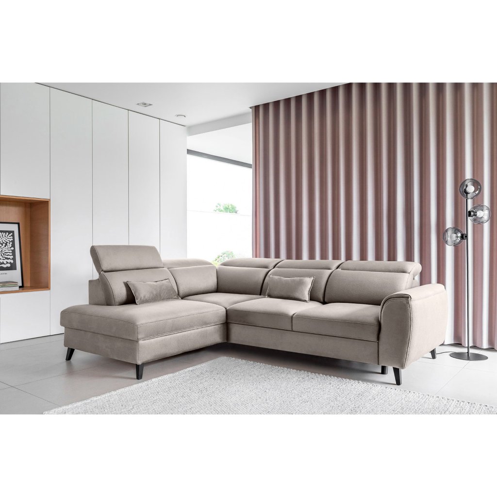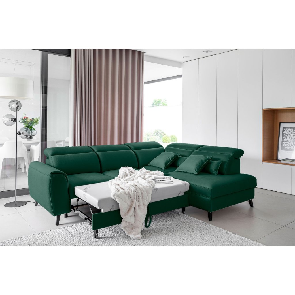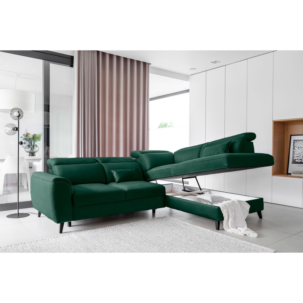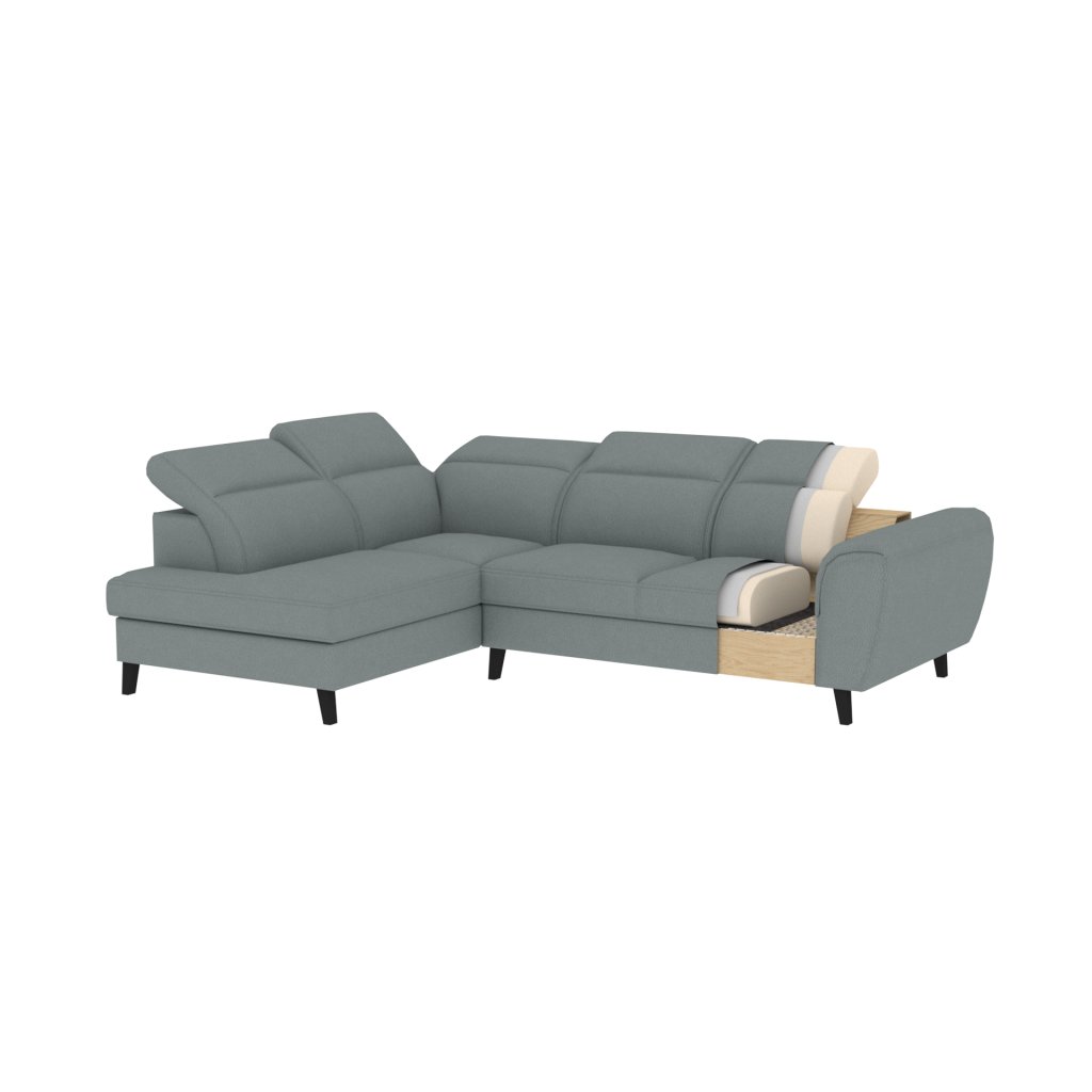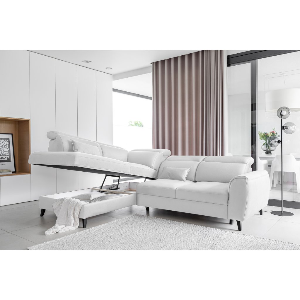 Tato rozkládací rohová sedací souprava má také kontejner na lůžkoviny. Skvělé místo pro uložení náhradních peřin nebo polštářů.