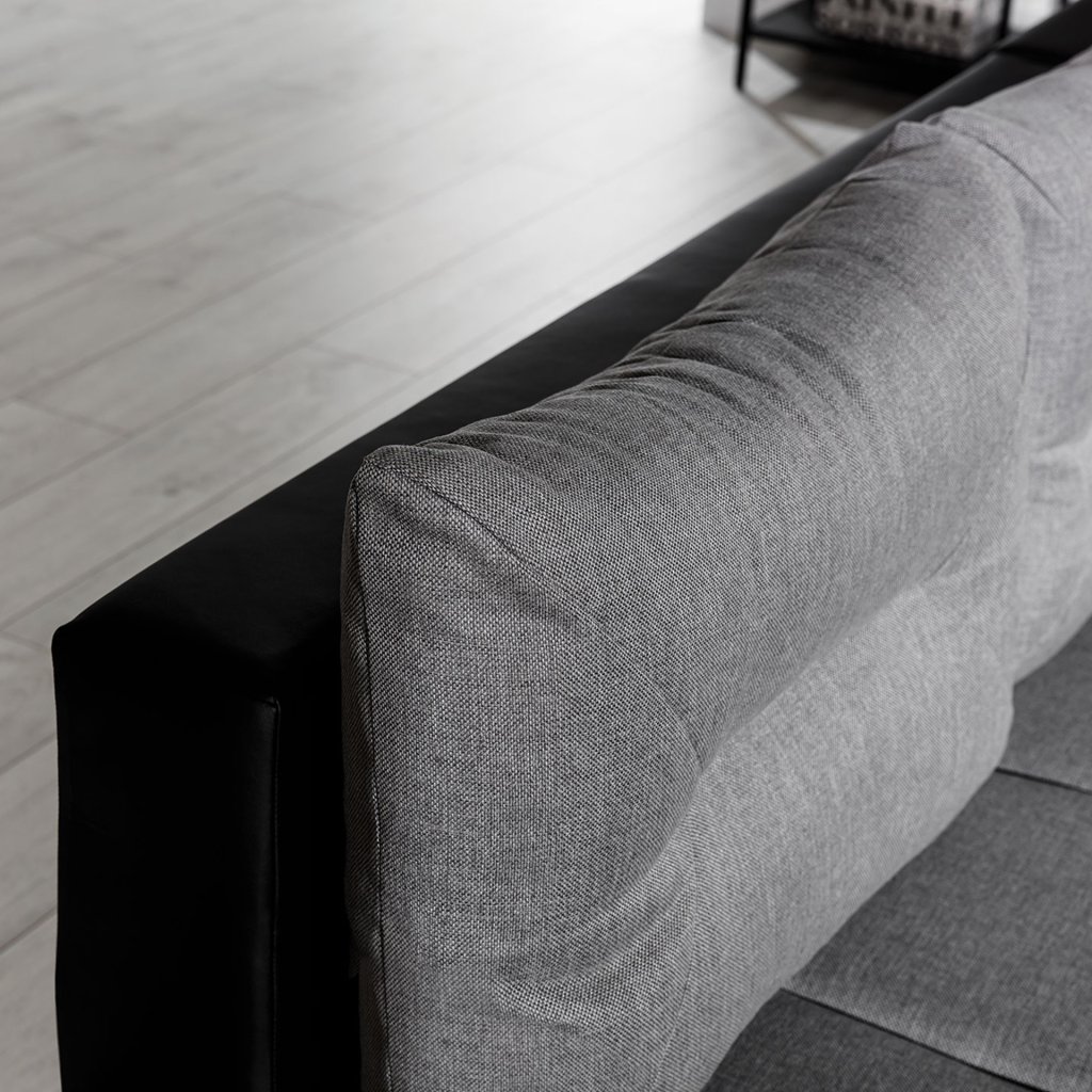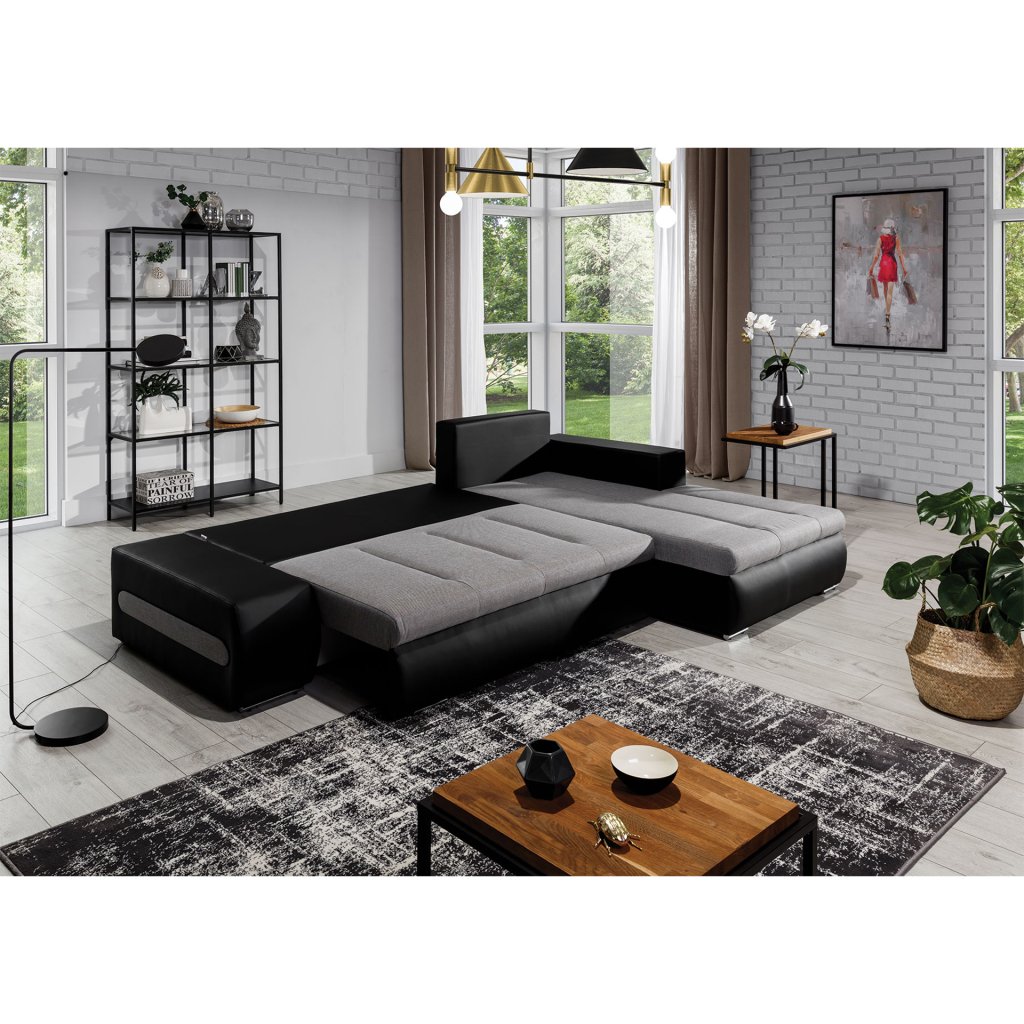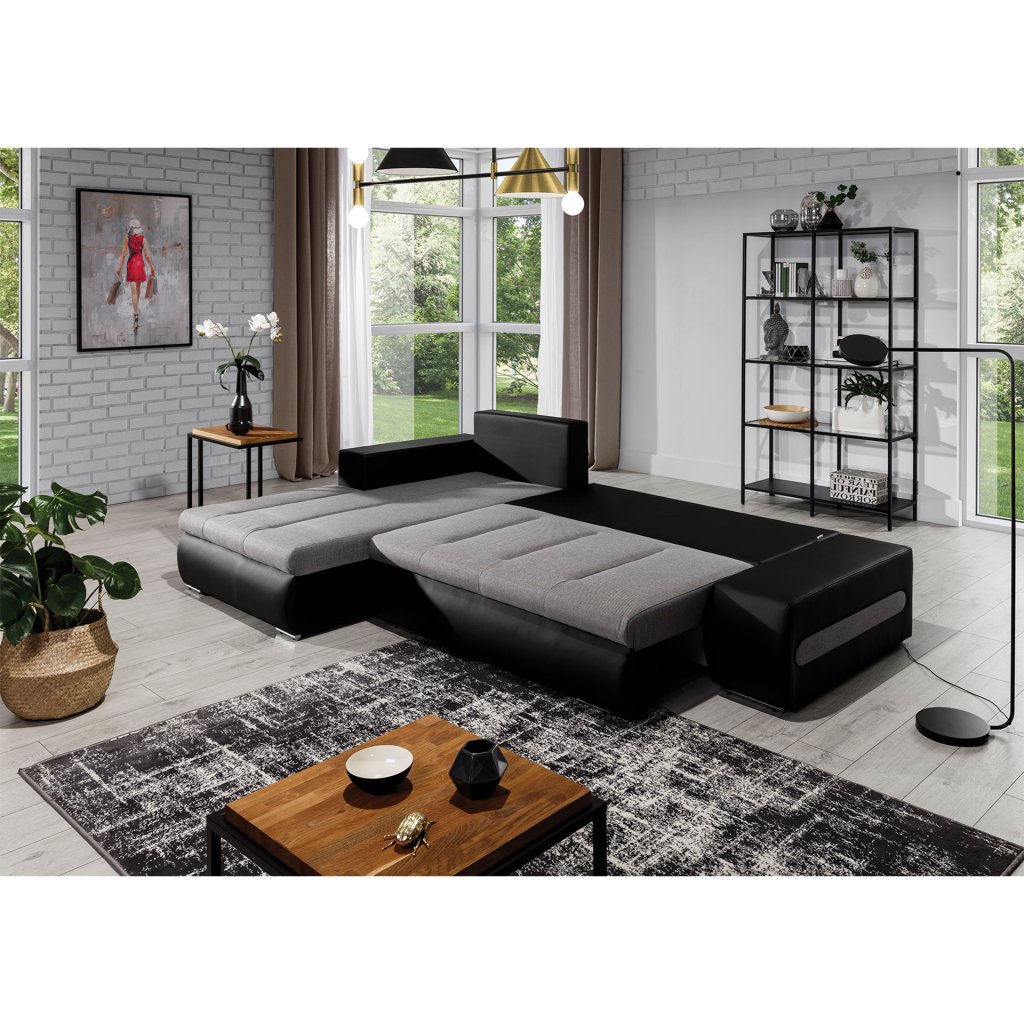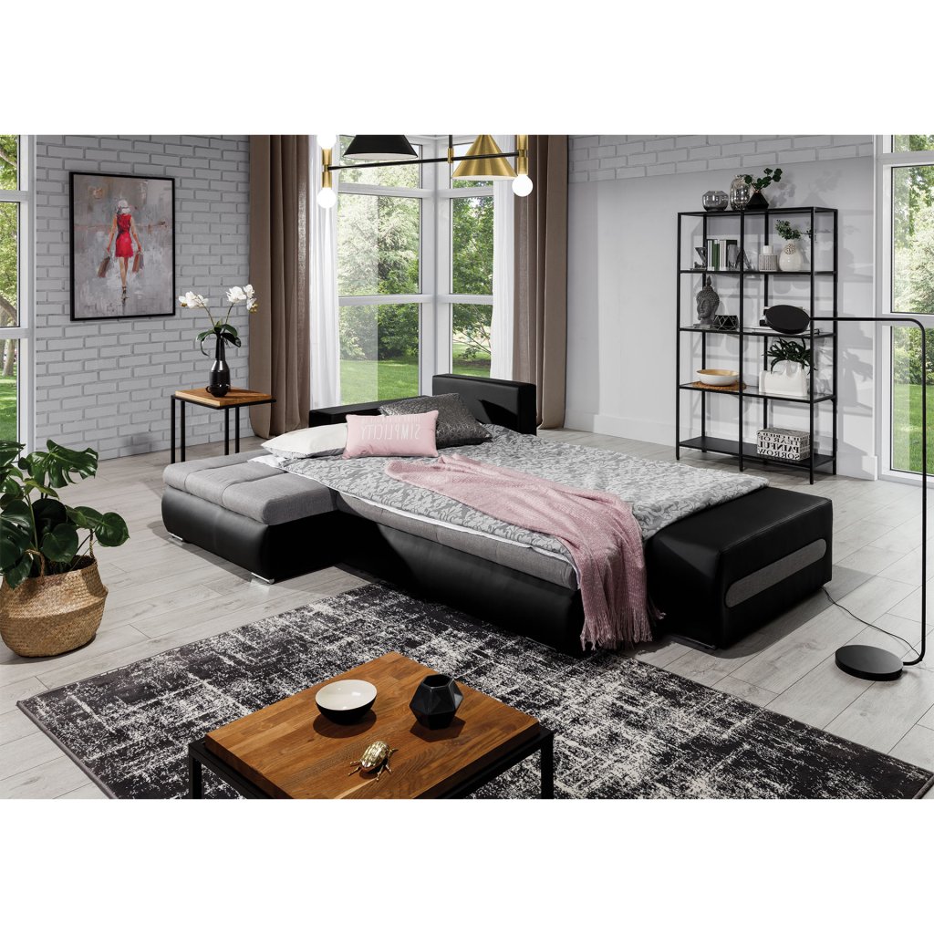 Náš nábytek je navíc vybaven funkcí spaní. Po rozložení se přemění na lůžko o rozměrech 195 x 135 cm. Přispívá k tomu jednoduchý a intuitivní typ rozkladu, který se skládá z výsuvného dna a výklopného opěradla.