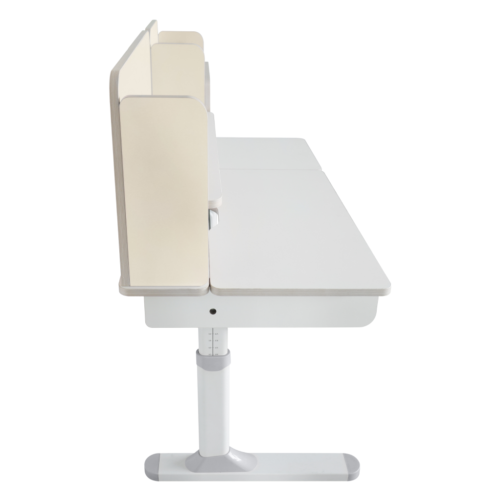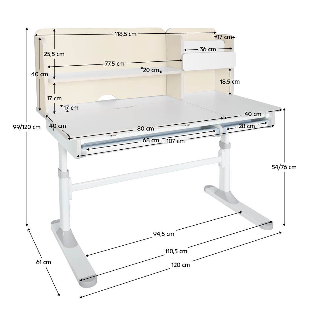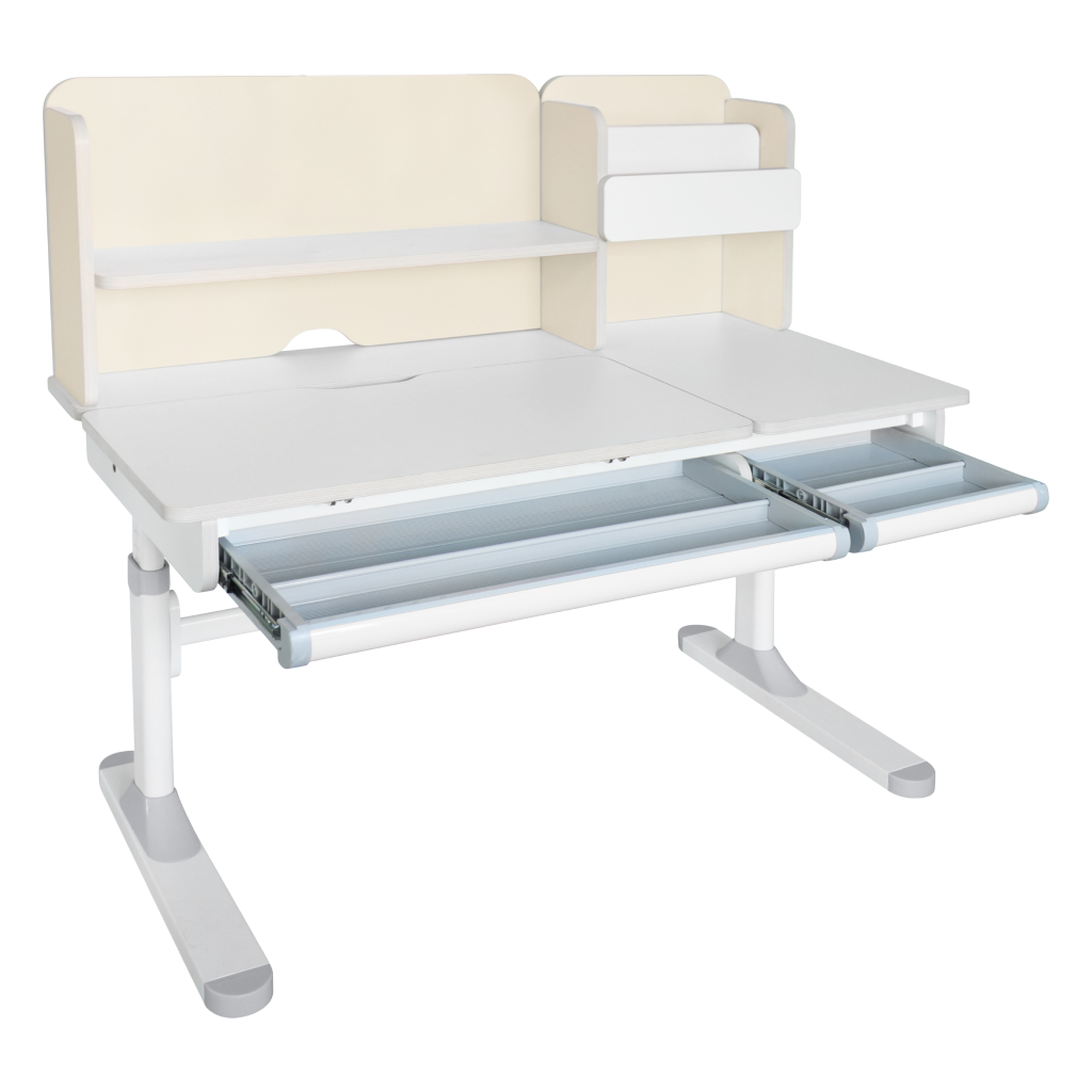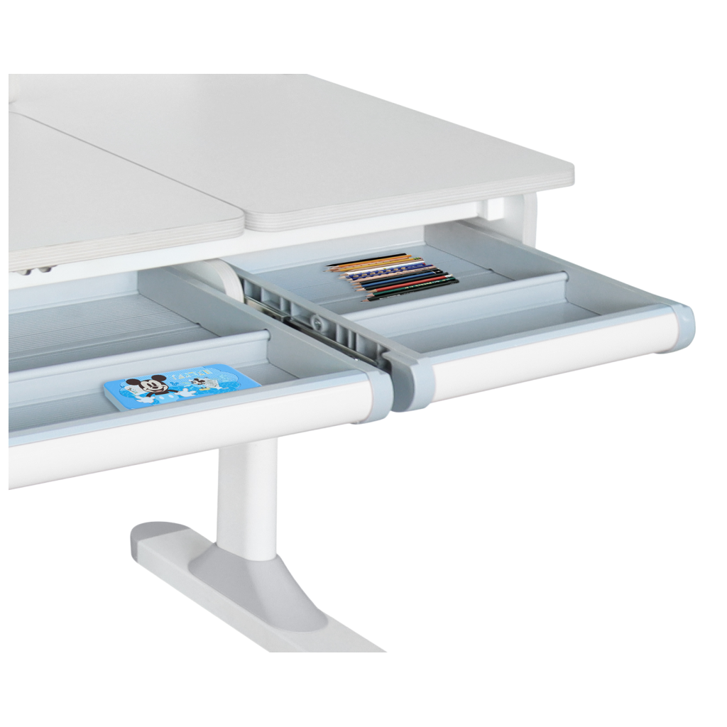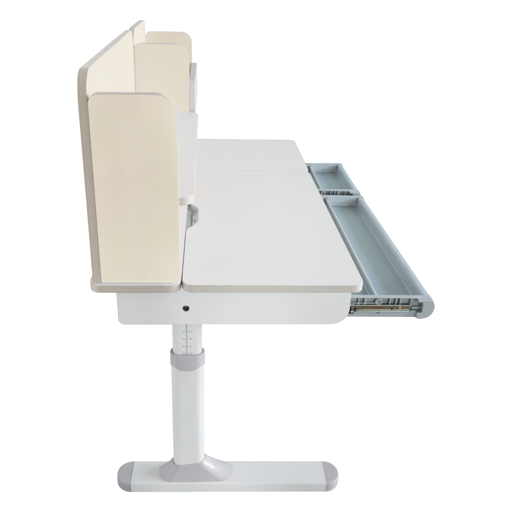 Tento stůl vyniká svou vysokou variabilitou, která umožňuje individuální přizpůsobení potřebám rostoucího dítěte. Praktické zásuvky s přihrádkami nabízejí dostatek úložného prostoru pro psací potřeby a sešity, zatímco zadní panel s policemi a držákem na knihy udržuje pracovní plochu uklizenou. Nechybí ani užitečný háček na zavěšení školní tašky.