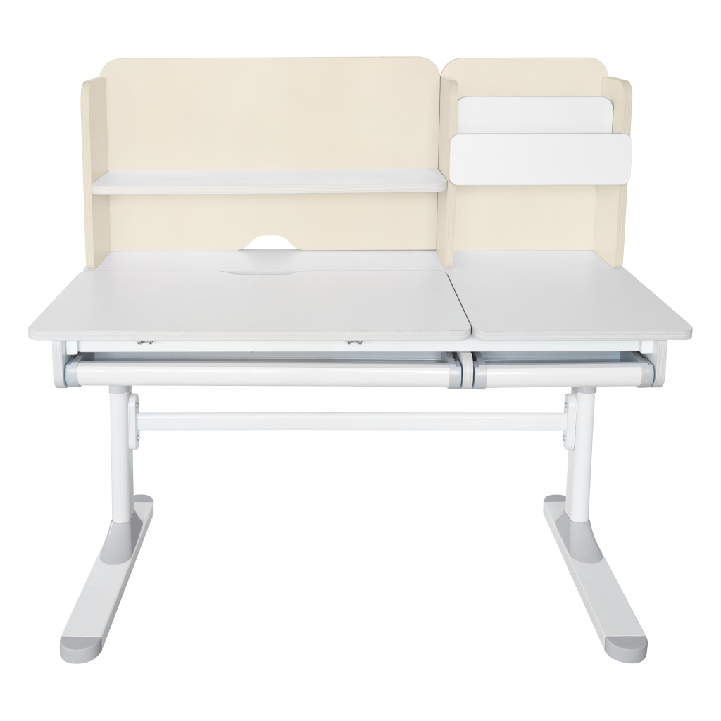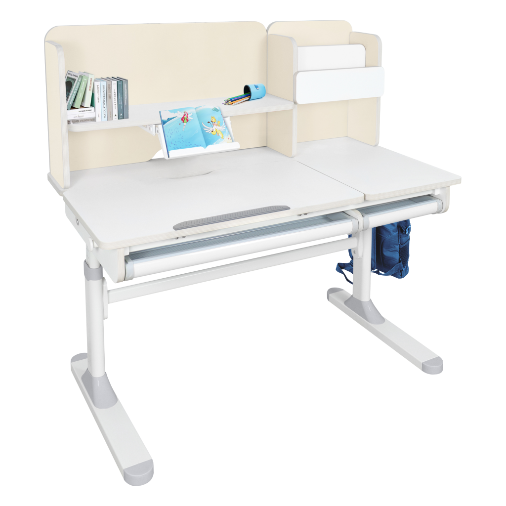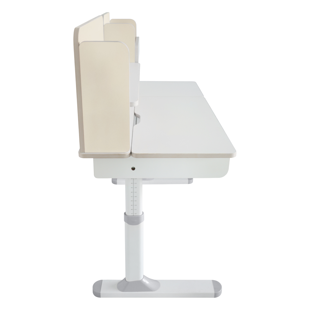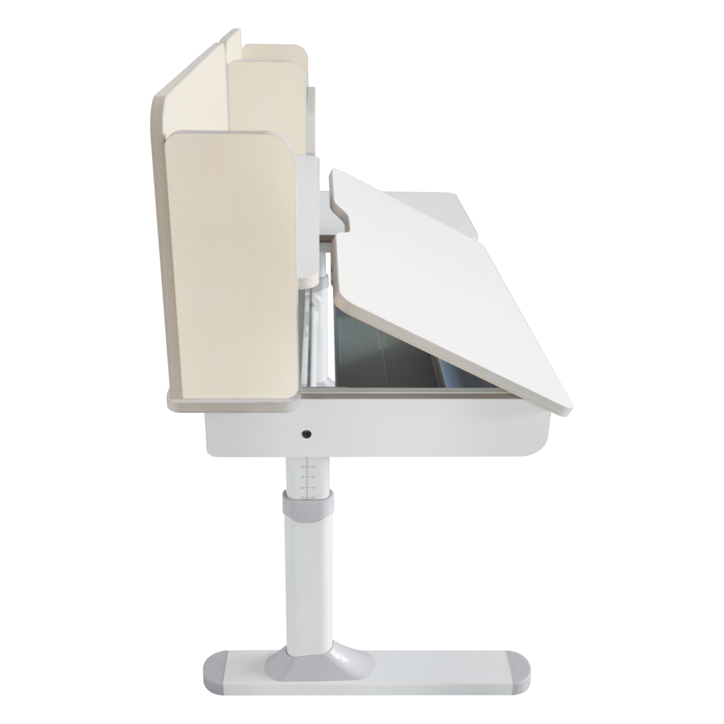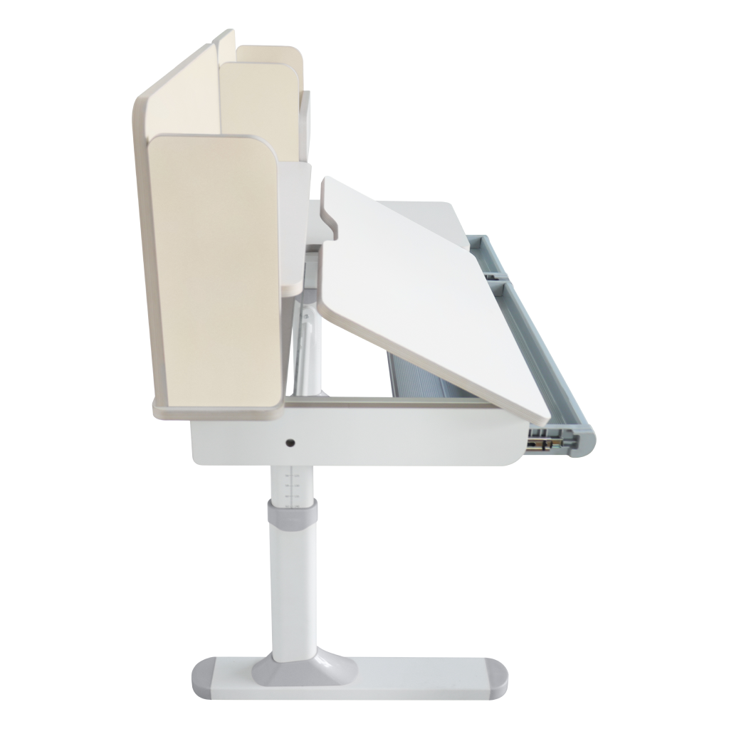 Tento stůl vyniká svou vysokou variabilitou, která umožňuje individuální přizpůsobení potřebám rostoucího dítěte. Praktické zásuvky s přihrádkami nabízejí dostatek úložného prostoru pro psací potřeby a sešity, zatímco zadní panel s policemi a držákem na knihy udržuje pracovní plochu uklizenou. Nechybí ani užitečný háček na zavěšení školní tašky.