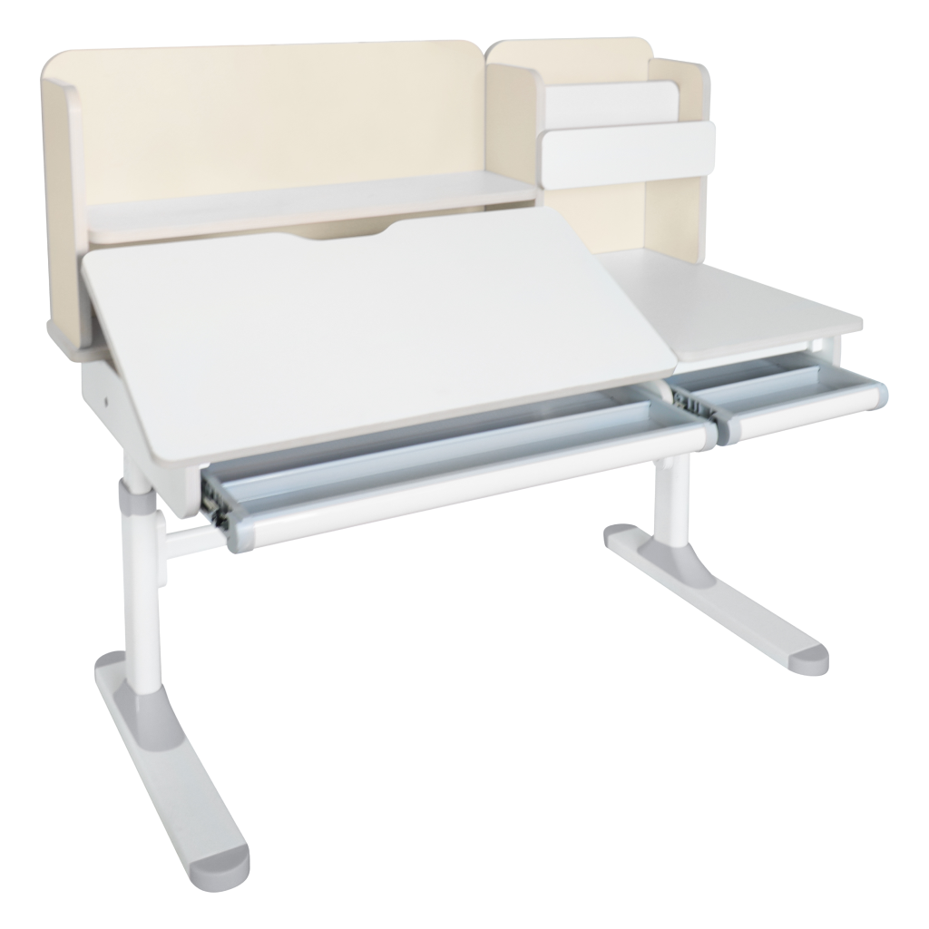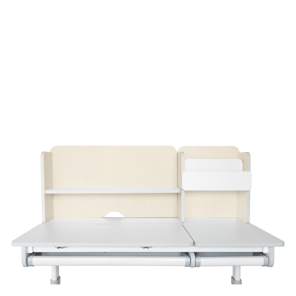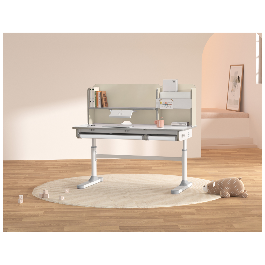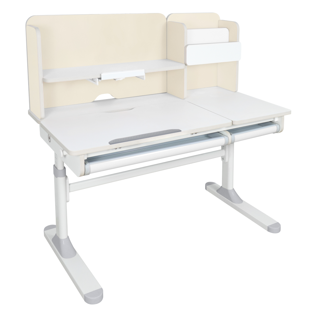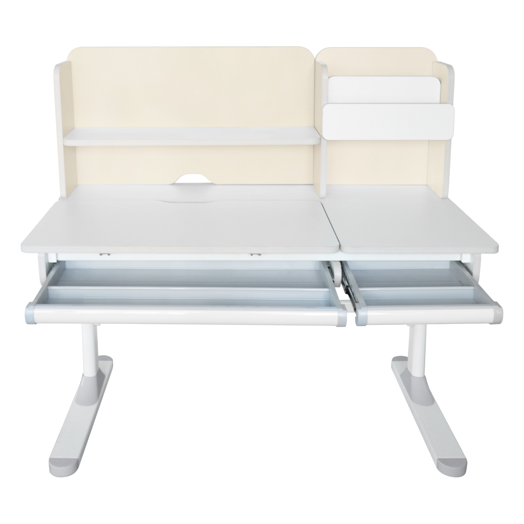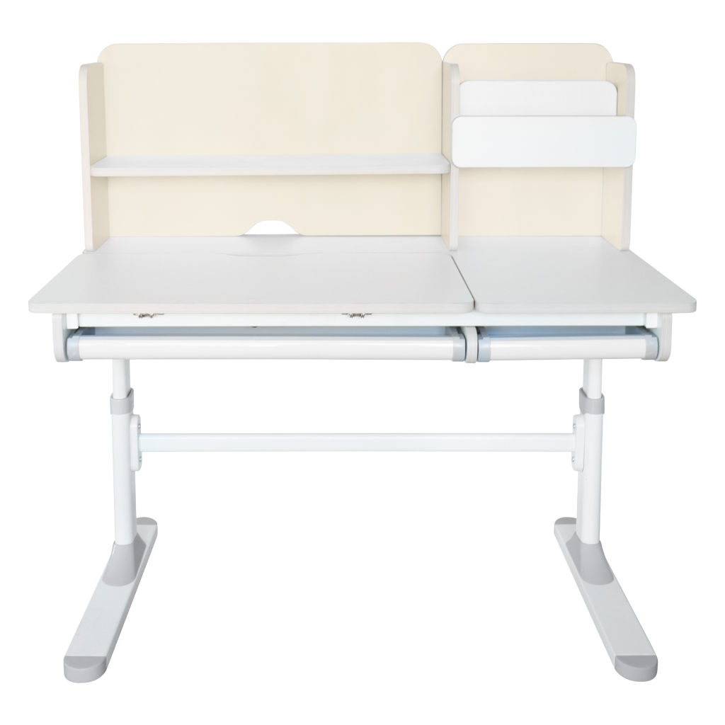 Tento stůl vyniká svou vysokou variabilitou, která umožňuje individuální přizpůsobení potřebám rostoucího dítěte. Praktické zásuvky s přihrádkami nabízejí dostatek úložného prostoru pro psací potřeby a sešity, zatímco zadní panel s policemi a držákem na knihy udržuje pracovní plochu uklizenou. Nechybí ani užitečný háček na zavěšení školní tašky.