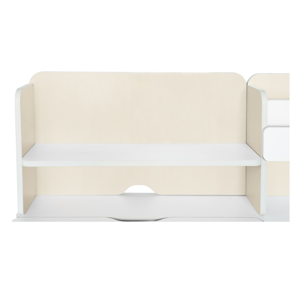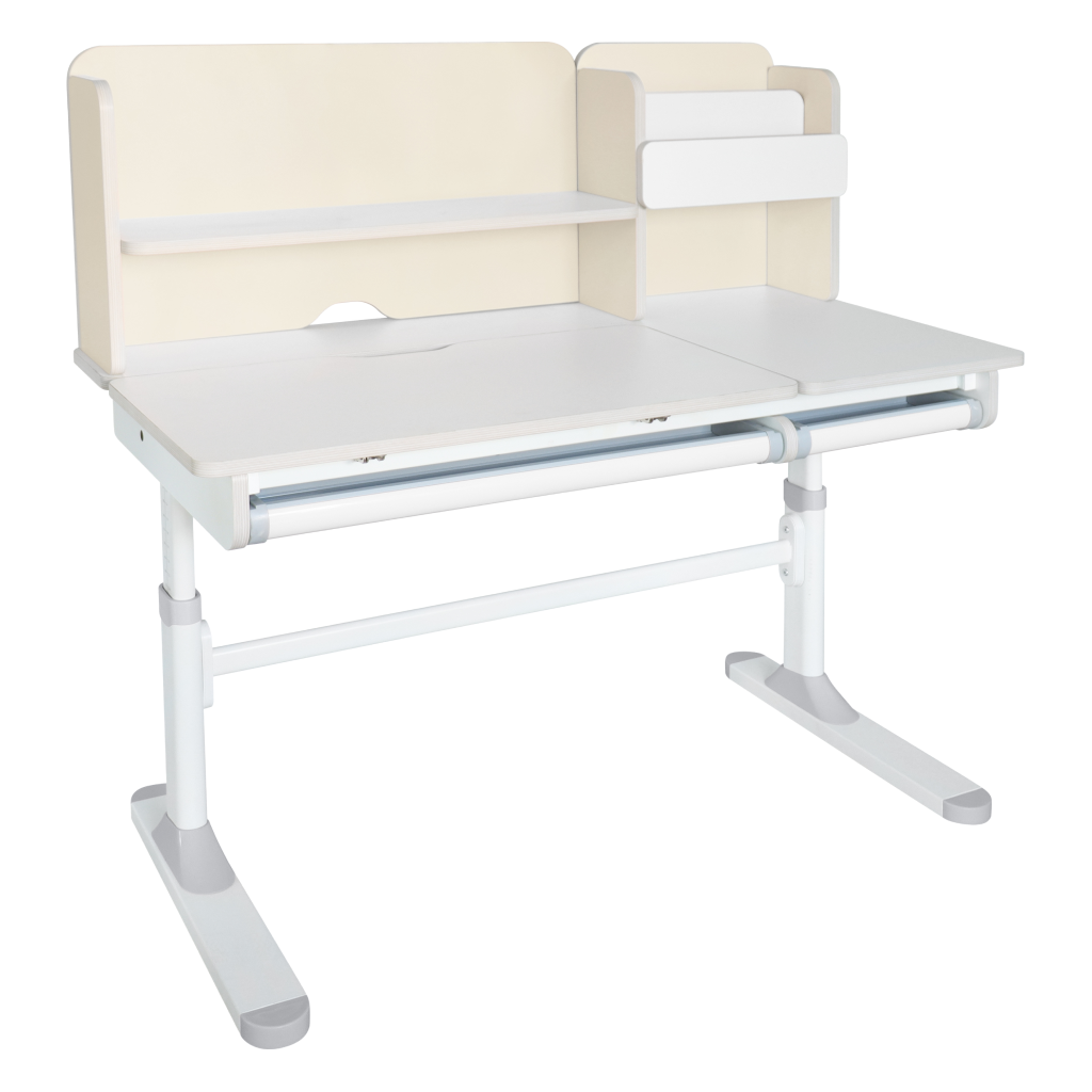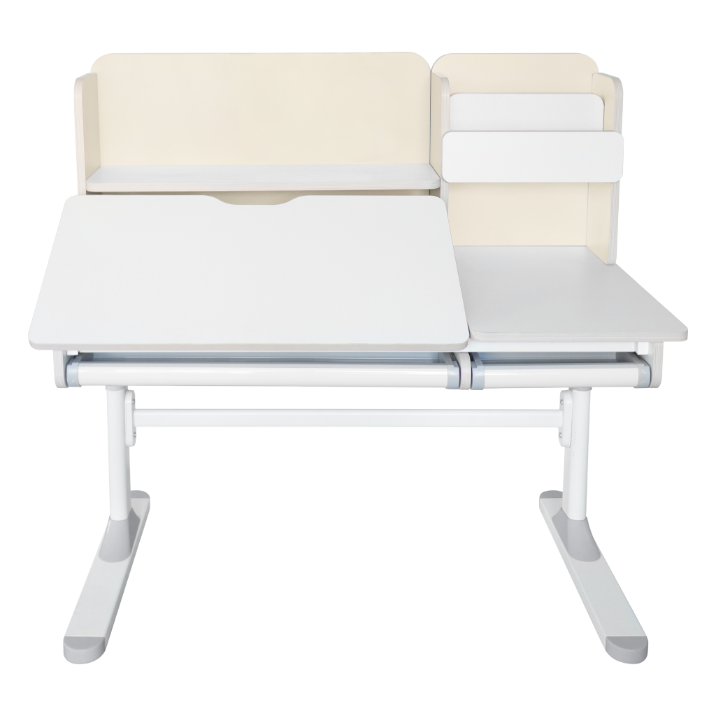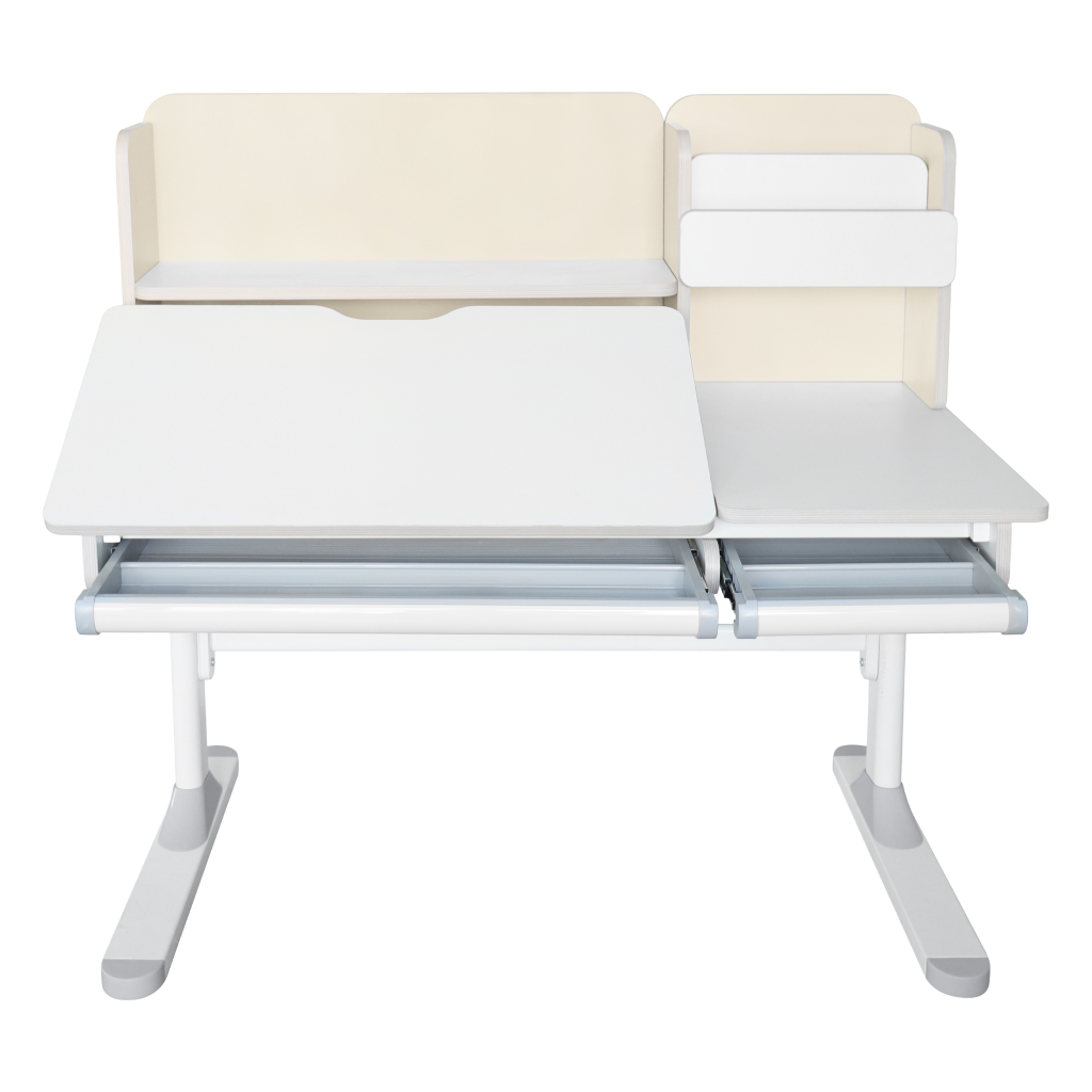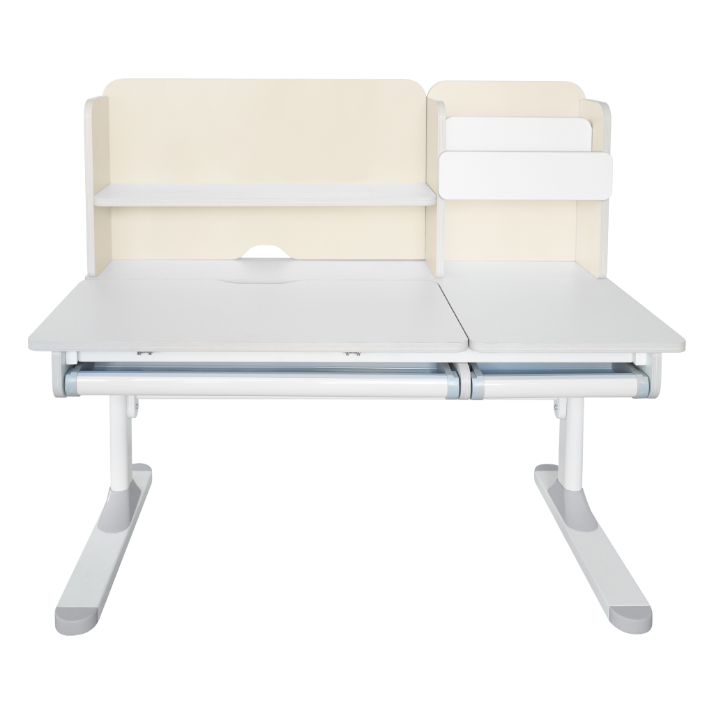 Tento stůl vyniká svou vysokou variabilitou, která umožňuje individuální přizpůsobení potřebám rostoucího dítěte. Praktické zásuvky s přihrádkami nabízejí dostatek úložného prostoru pro psací potřeby a sešity, zatímco zadní panel s policemi a držákem na knihy udržuje pracovní plochu uklizenou. Nechybí ani užitečný háček na zavěšení školní tašky.
