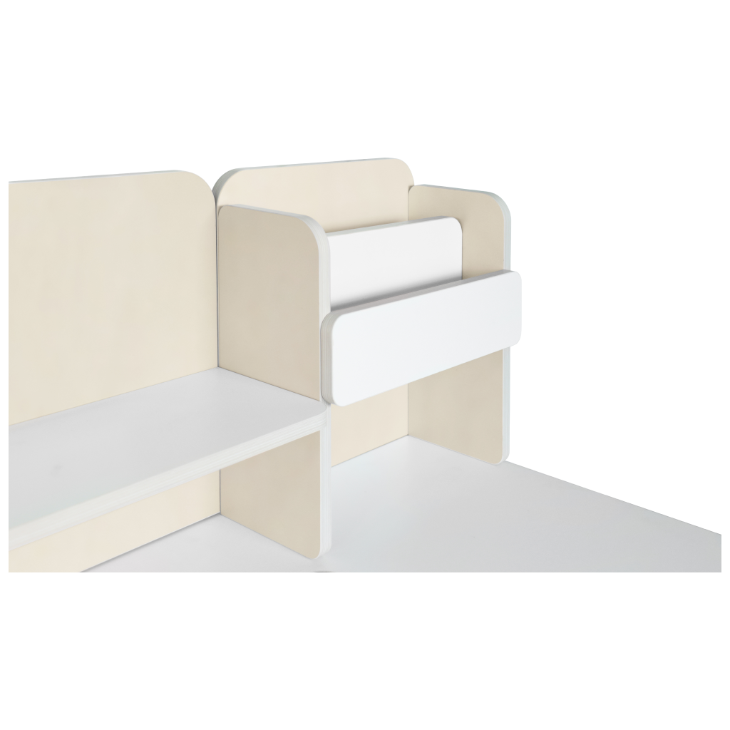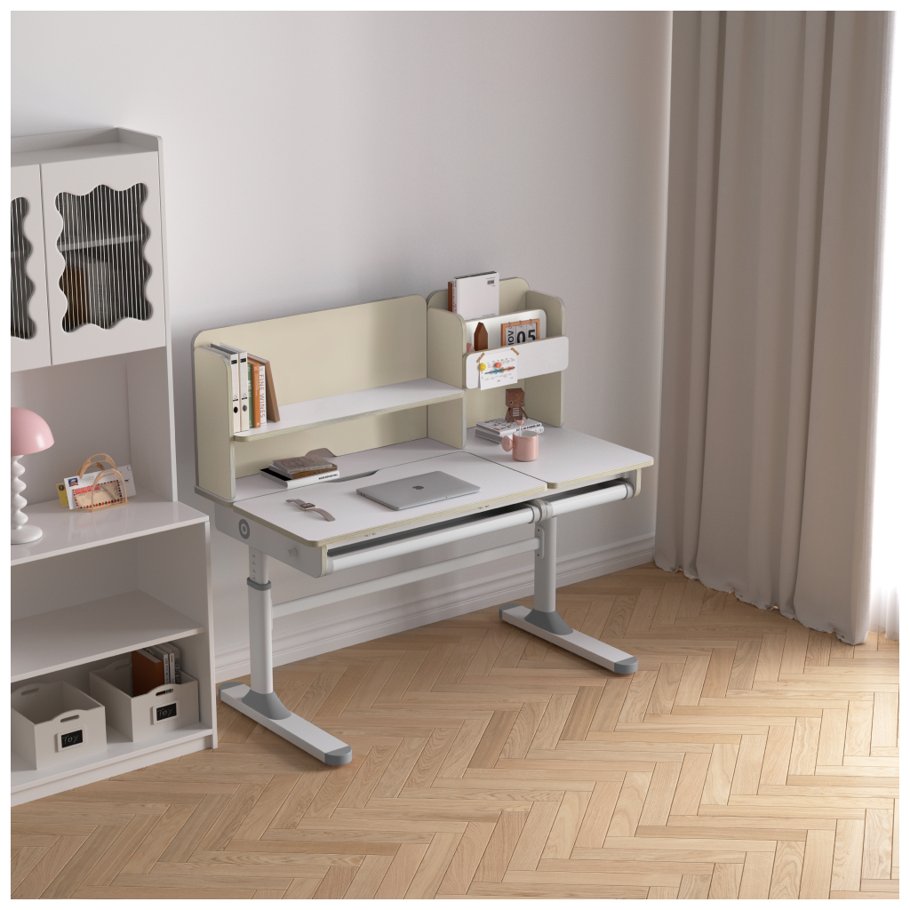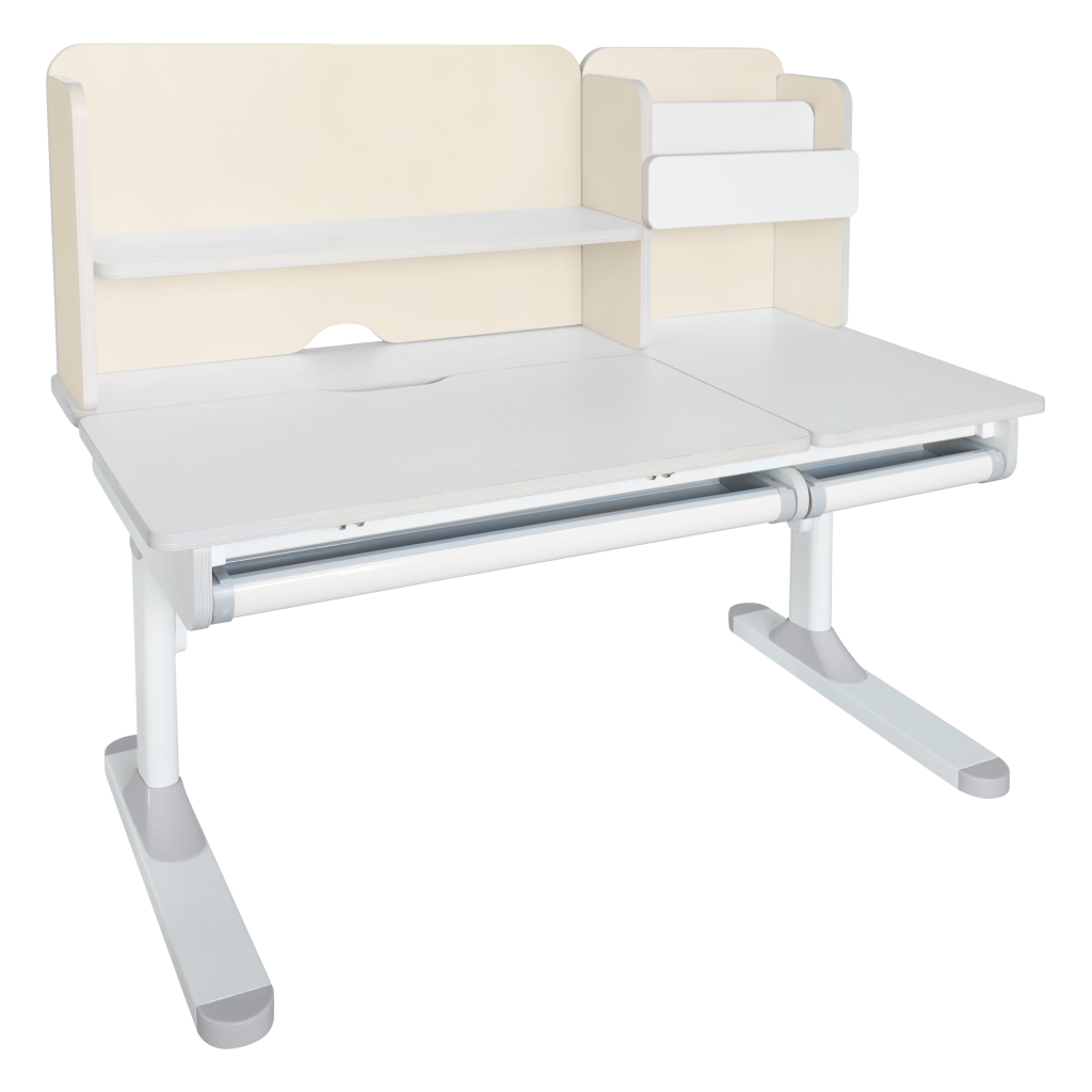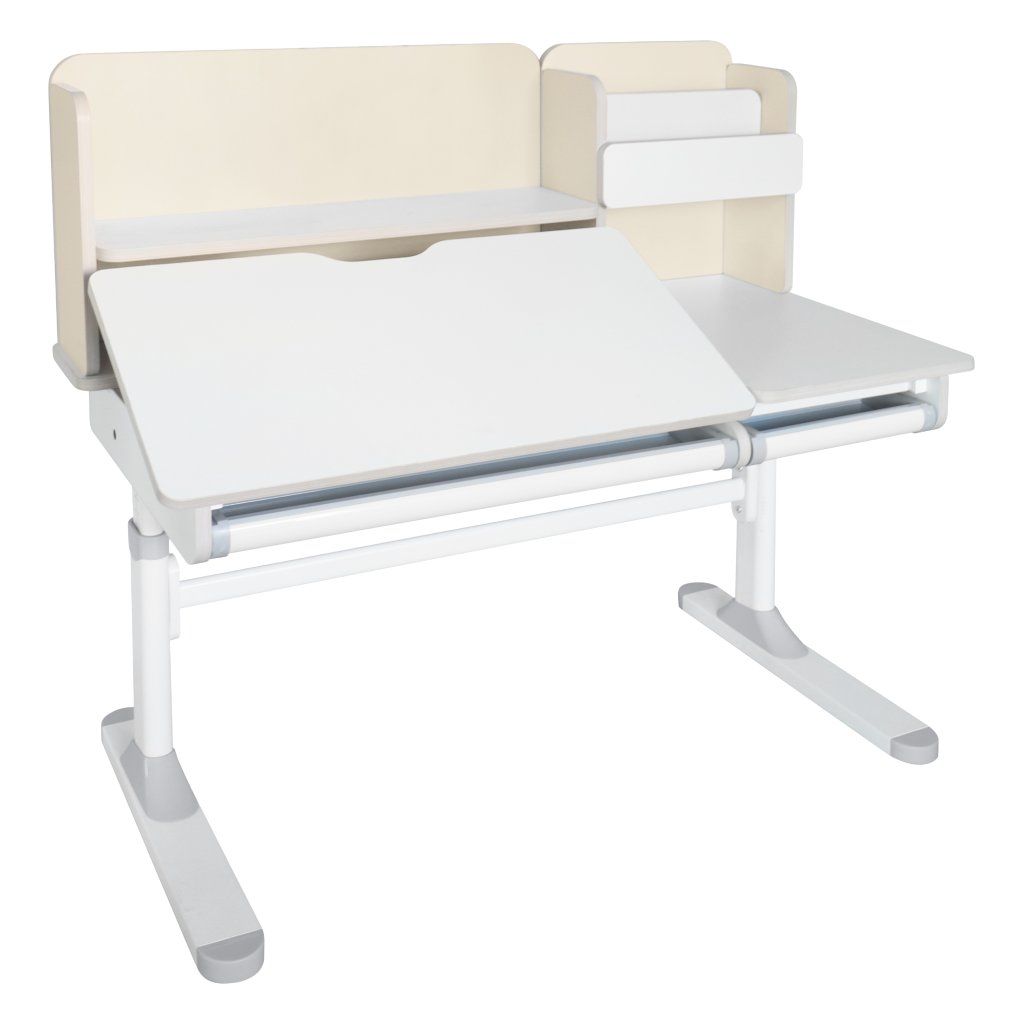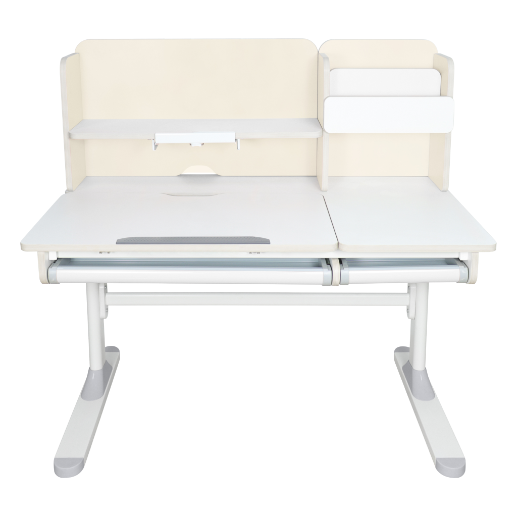 Tento stůl vyniká svou vysokou variabilitou, která umožňuje individuální přizpůsobení potřebám rostoucího dítěte. Praktické zásuvky s přihrádkami nabízejí dostatek úložného prostoru pro psací potřeby a sešity, zatímco zadní panel s policemi a držákem na knihy udržuje pracovní plochu uklizenou. Nechybí ani užitečný háček na zavěšení školní tašky.