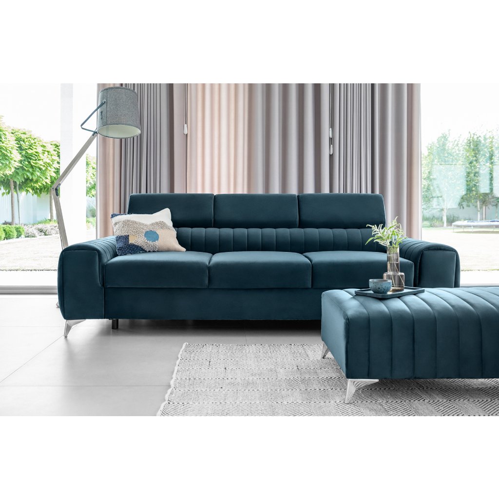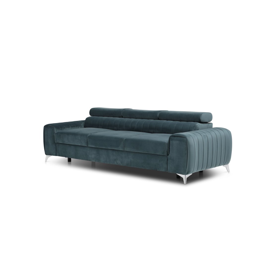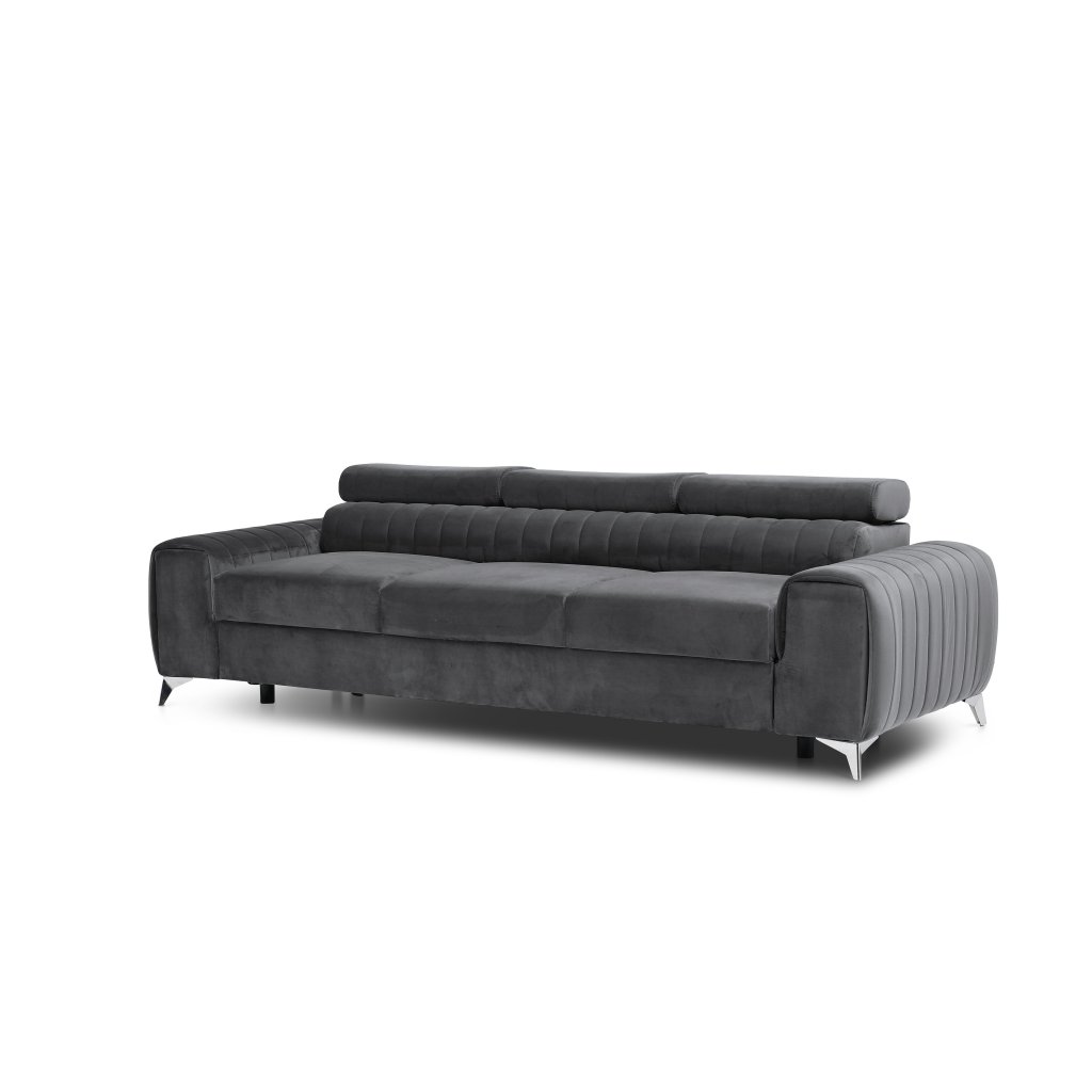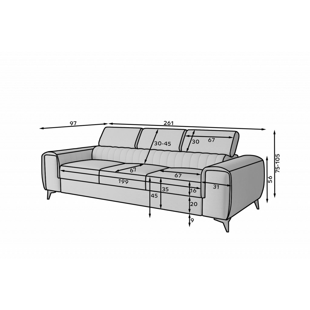 Pohovka Laurence má masivní dřevěný rám, který spočívá na diagonálních chromovaných kovových nohách. Pohovka je potažena elegantními látkami z kolekce ELTAP a její sedák je vyplněn pěnou HR a T30. Kromě toho je kus nábytku podepřen robustními vlnitými pružinami typu B, které poskytují pocit pohodlí a komfortu. Pohovka Laurence vnáší do interiéru lehkost a styl. Klasický tvar kusu nábytku je rozbit prošitím a jasně zdůrazněným rozdělením kusu nábytku na tři místa v sedací části.Pohovka Laurence je ideální volbou do menších místností, kam nelze umístit například rohovou pohovku. Její rozměry jsou: Rozměry: 261x97x105 cm. Výška nožiček nábytku umožňuje úklid moderními úklidovými roboty pod pohovkou, protože je 9 cm.