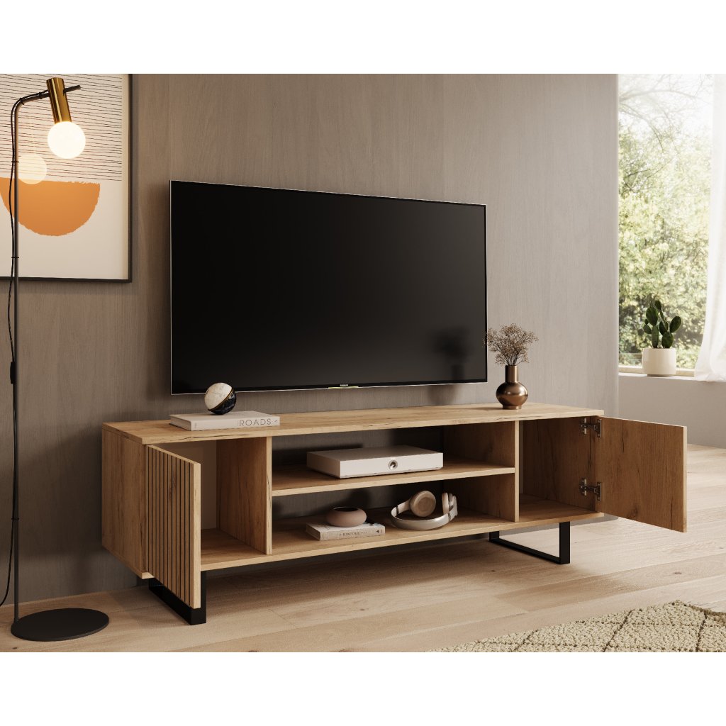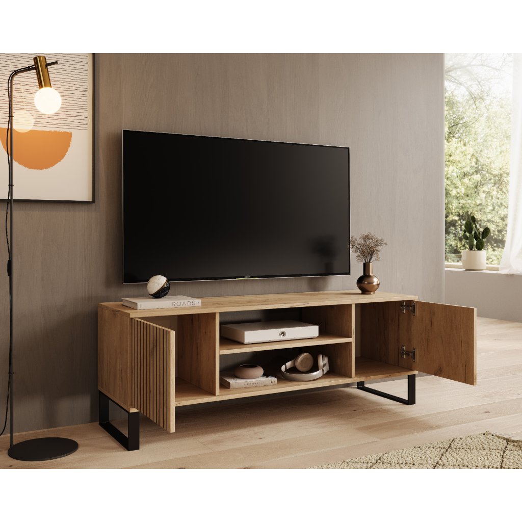 RTV stolek Lorello spojuje eleganci s moderním designem, díky čemuž přidá vašemu interiéru unikátní atmosféru. Čelní plochy jsou zdobeny jemnými lamelovými motivy, což nábytku dodává originální styl inspirovaný skandinávskou a industriální estetikou.