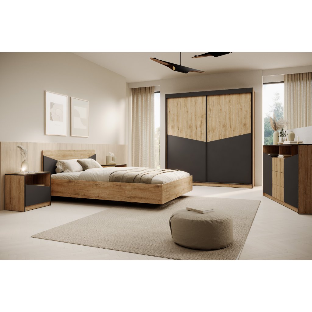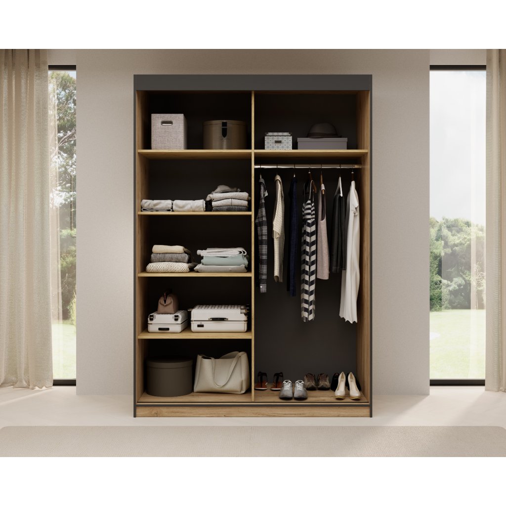 Elegantní povrchová úprava v kombinaci černé barvy a doplňků v dekoru dubu na dveřích dodává skříni přirozený a nadčasový vzhled, díky kterému skvěle zapadne do různých stylů zařízení – od klasických po moderní interiéry.