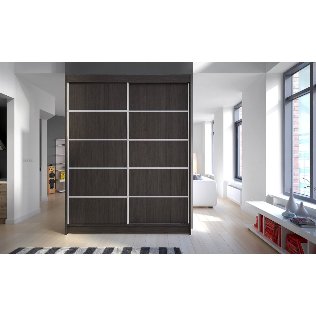 Charakteristickým prvkem skříně jsou horizontální stříbrné pruhy na čelních plochách skříně, které jí dodávají moderní a jedinečný vzhled. Díky posuvnému systému dveří šetří místo, a proto je ideální i do menších místností nebo úzkých prostor.