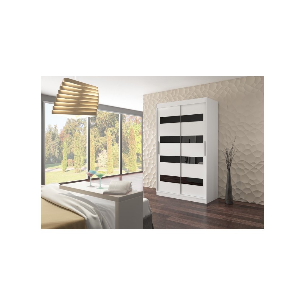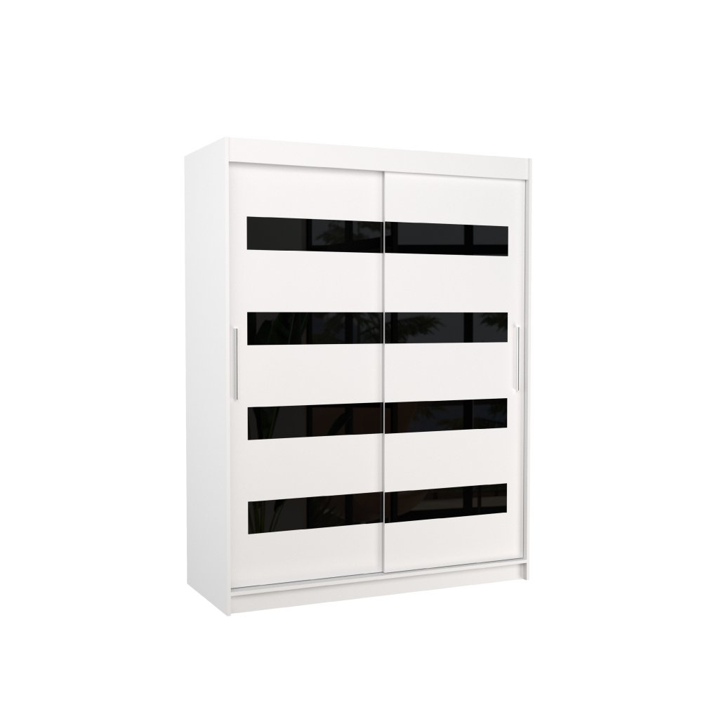 Dominantním prvkem skříně jsou dekorativní prvky z černého lakovaného skla (Lacobel) na přední straně, které dodávají nábytku moderní a elegantní charakter. Díky posuvnému systému dveří není potřeba žádný dodatečný prostor pro otevírání, což dělá ze skříně ideální volbu do menších pokojů nebo úzkých chodeb.