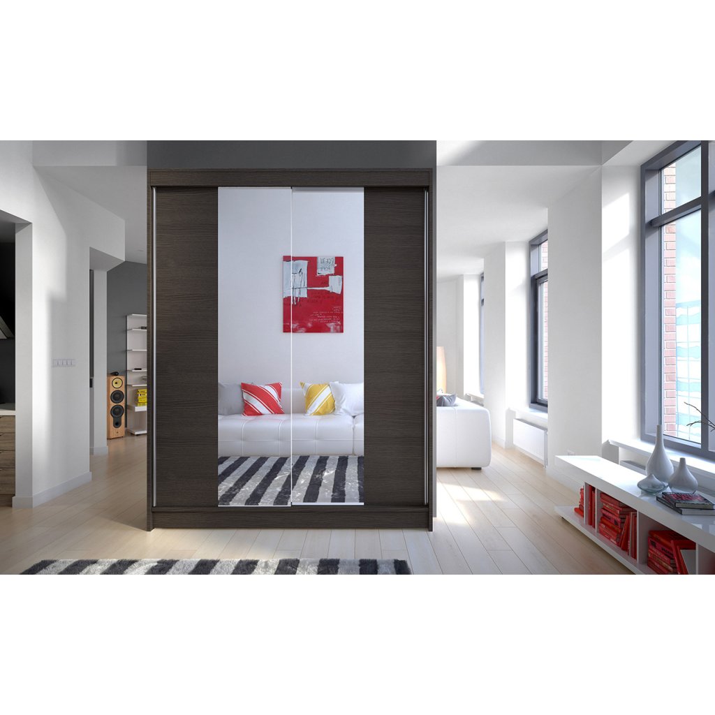 Na dveřích skříně jsou umístěna zrcadla, která opticky zvětšují místnost a dodávají interiéru světlost a eleganci.