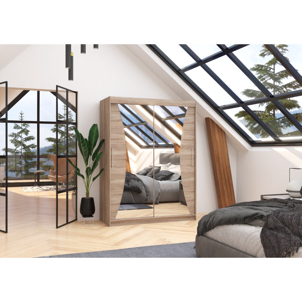 Na dveřích skříně se nachází designová zrcadlová plocha, která nejenže opticky zvětšuje prostor, ale zároveň zvyšuje praktičnost při každodenní přípravě na den.