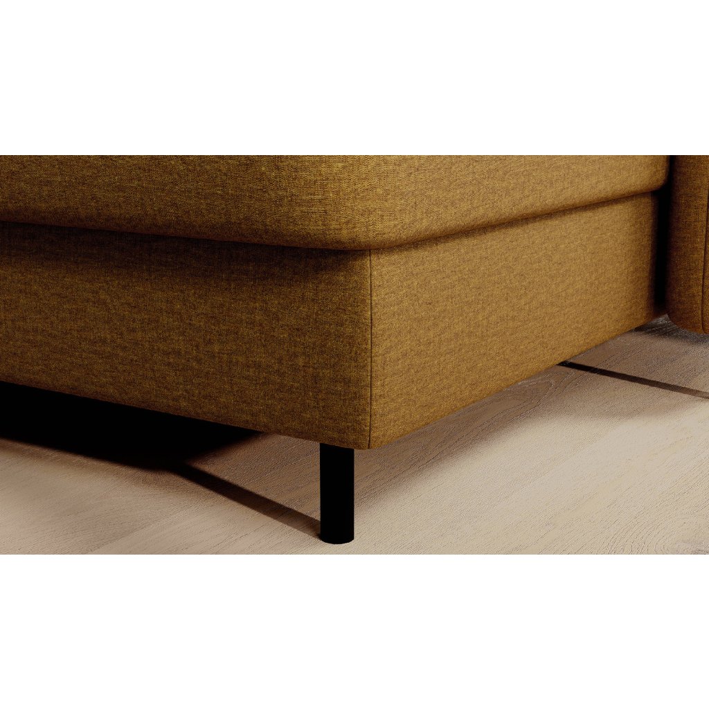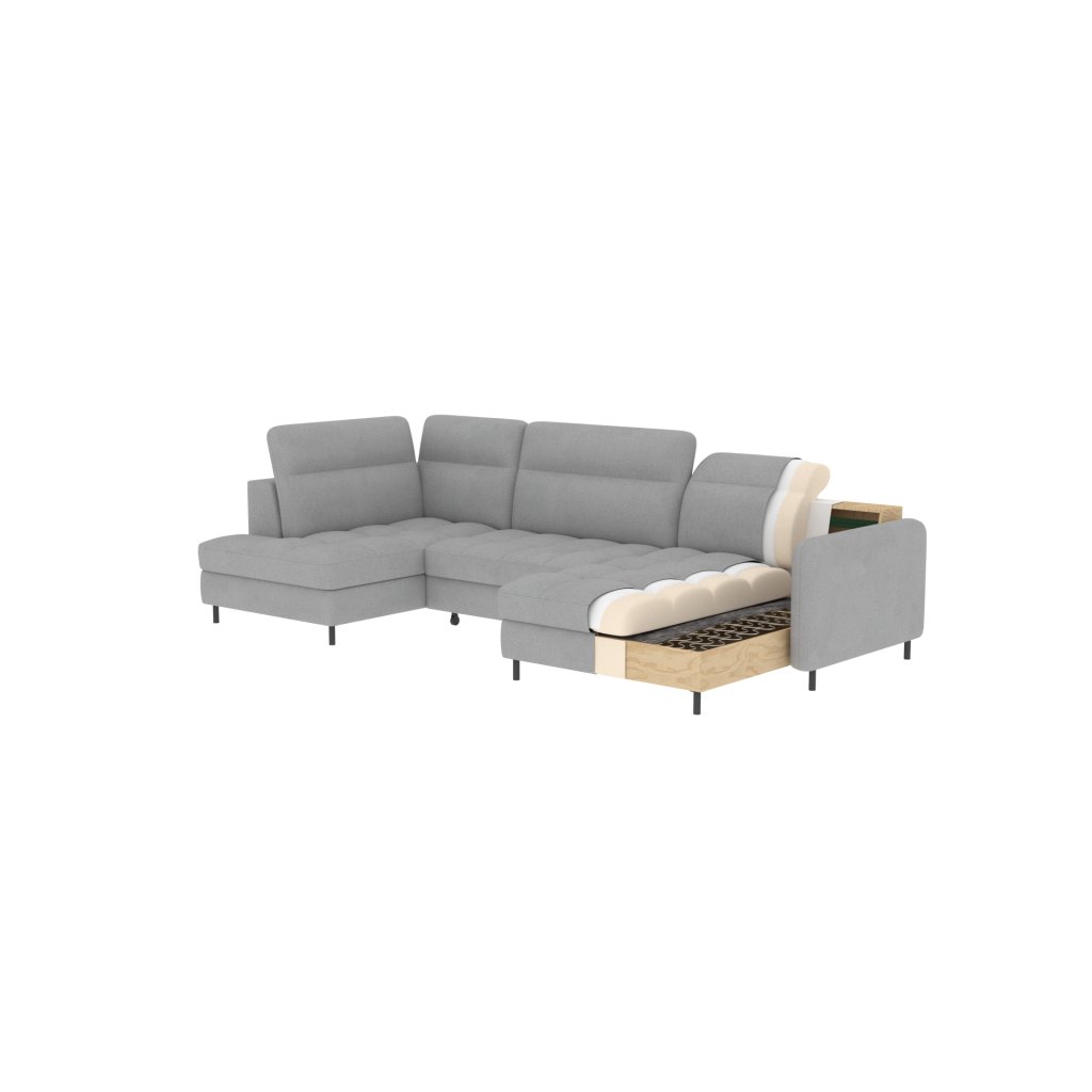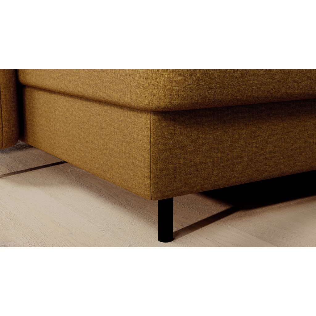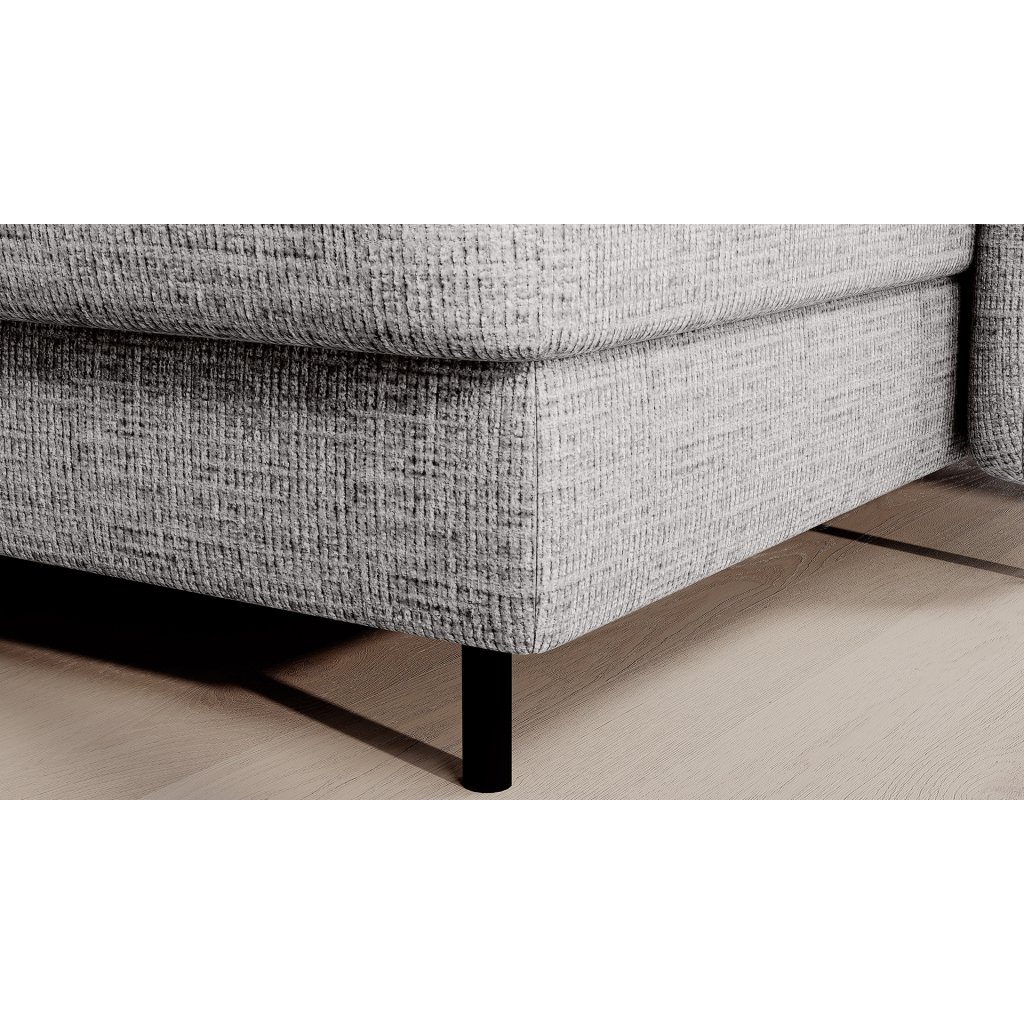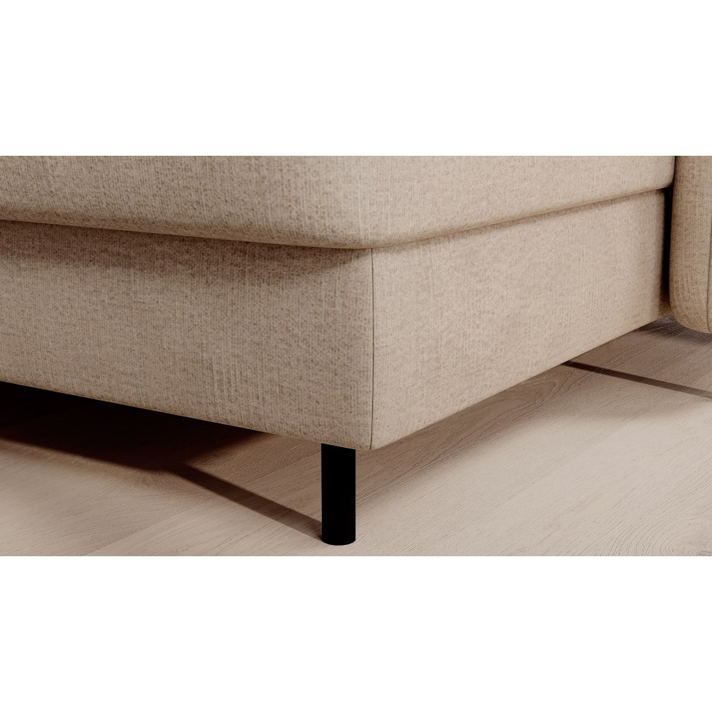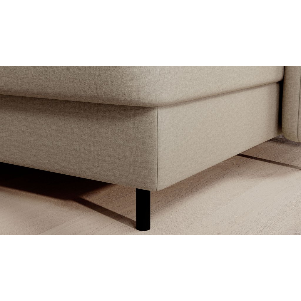Černé ocelové nohy mu dodávají moderní nádech a elegantní design z něj činí dokonalý designový prvek pro váš obývací pokoj. Rohová sedací souprava Berrto je vybavena snadno použitelným mechanismem Dolphin, který umožňuje rychlou přeměnu na pohodlné lůžko. Je dokonalým řešením, když potřebujete místo na spaní pro hosty.