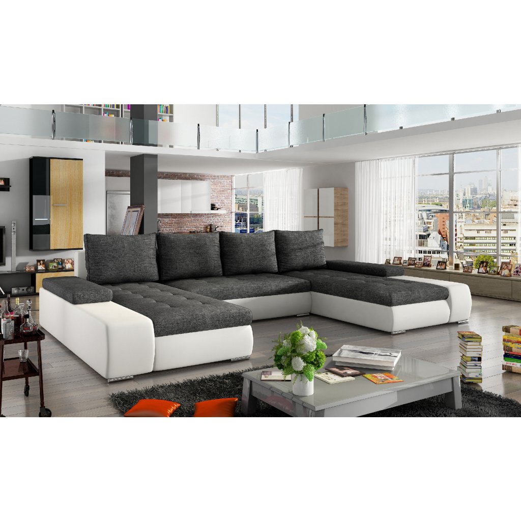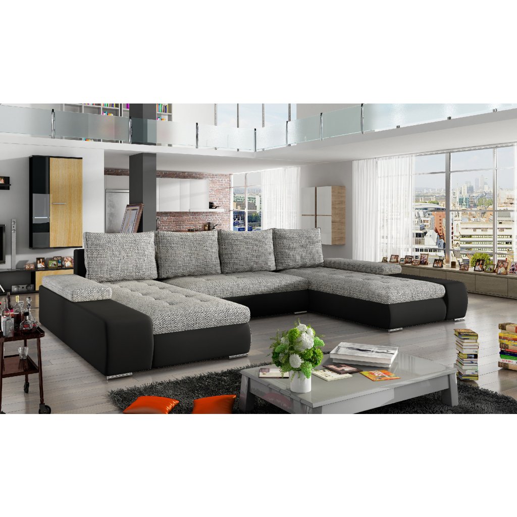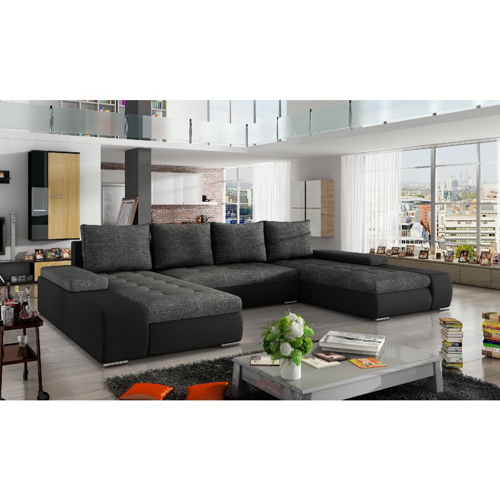 Marino je prostorná, pohodlná a stylová rohová sedací souprava s velkými rozměry 363 x 200 x 88 cm. Maximální pohodlí našeho kusu nábytku ve tvaru písmene U ovlivňují: správně profilované opěráky, široké područky vybavené přídavnými obdélníkovými polštáři a sedák vyplněný vlnitou pružinou a pěnou T30 odolnou proti poškození.Naši rohovou sedací soupravu lze velmi jednoduše a efektivně přeměnit na lůžko o rozměrech 297 x 122 cm pomocí výsuvného sedáku a výklopného opěradla. Kromě toho má velkorysý prostor na lůžkoviny.