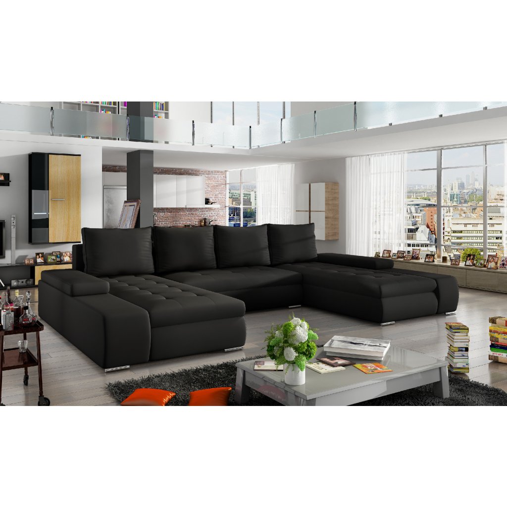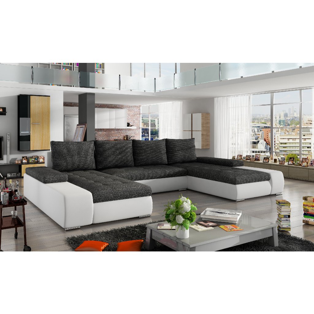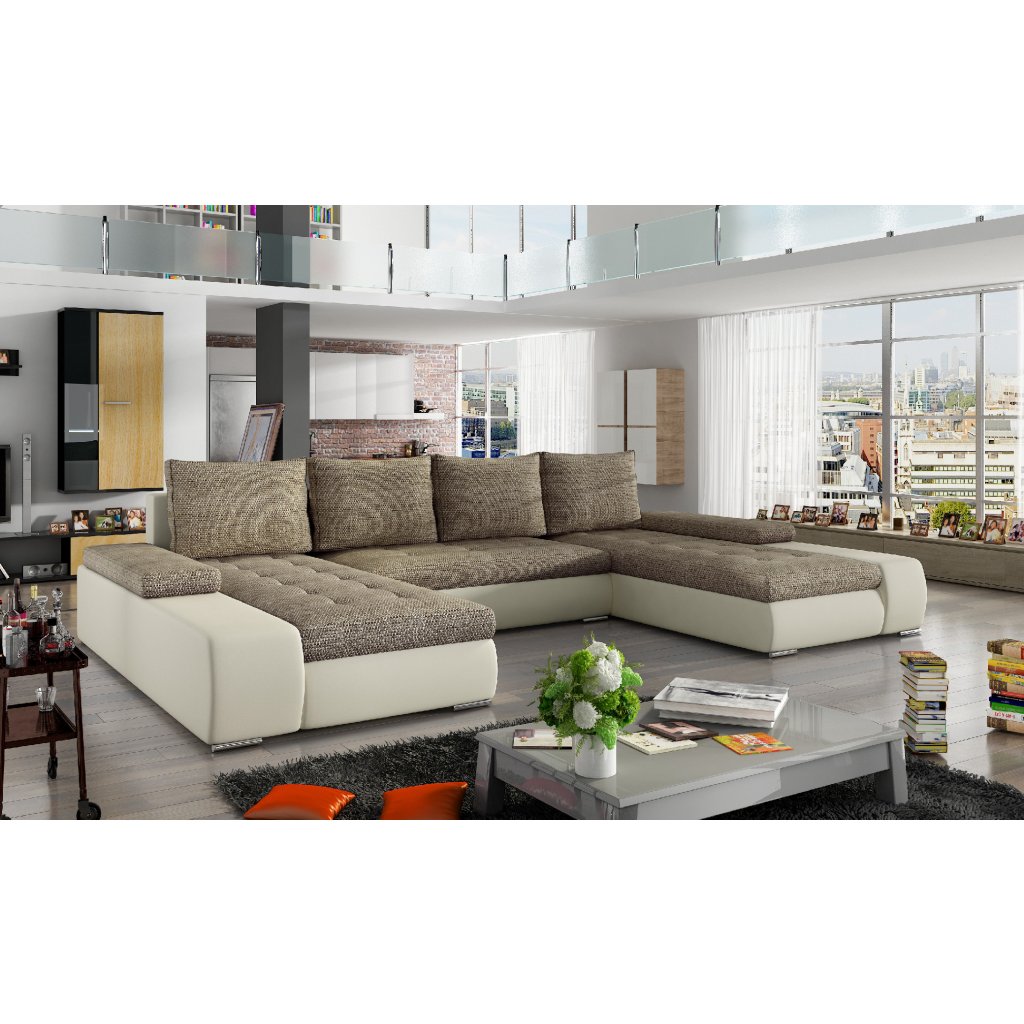 Marino je prostorná, pohodlná a stylová rohová sedací souprava s velkými rozměry 363 x 200 x 88 cm. Maximální pohodlí našeho kusu nábytku ve tvaru písmene U ovlivňují: správně profilované opěráky, široké područky vybavené přídavnými obdélníkovými polštáři a sedák vyplněný vlnitou pružinou a pěnou T30 odolnou proti poškození.Naši rohovou sedací soupravu lze velmi jednoduše a efektivně přeměnit na lůžko o rozměrech 297 x 122 cm pomocí výsuvného sedáku a výklopného opěradla. Kromě toho má velkorysý prostor na lůžkoviny.
