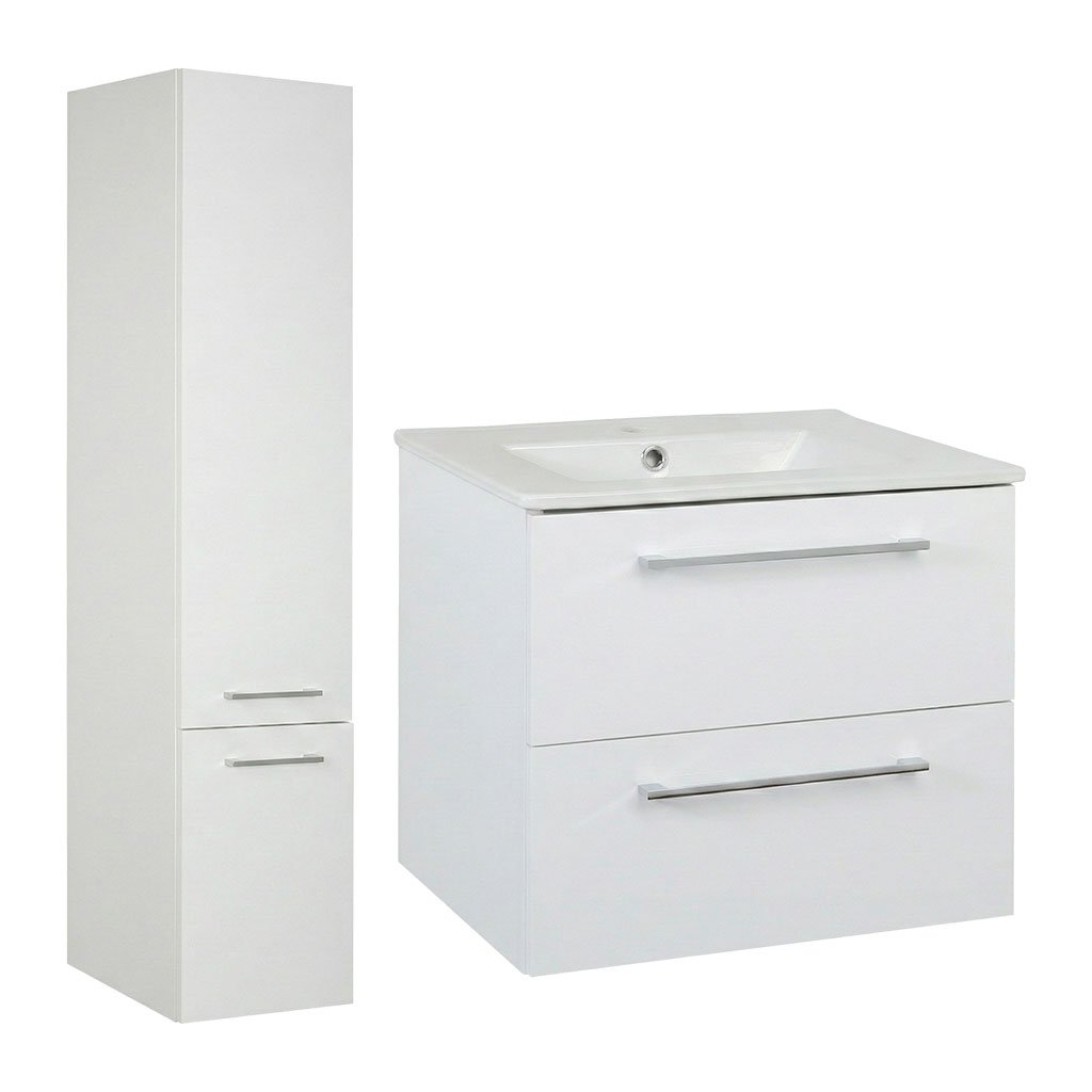 Vytvořte si harmonickou a přehlednou koupelnu s touto ucelenou nábytkovou sestavou. Kombinace umyvadlové skříňky a vysokého sloupku v jednotném designu "bílý lesk" dodá interiéru moderní nádech a poskytne velkorysé úložné prostory i v menších koupelnách.