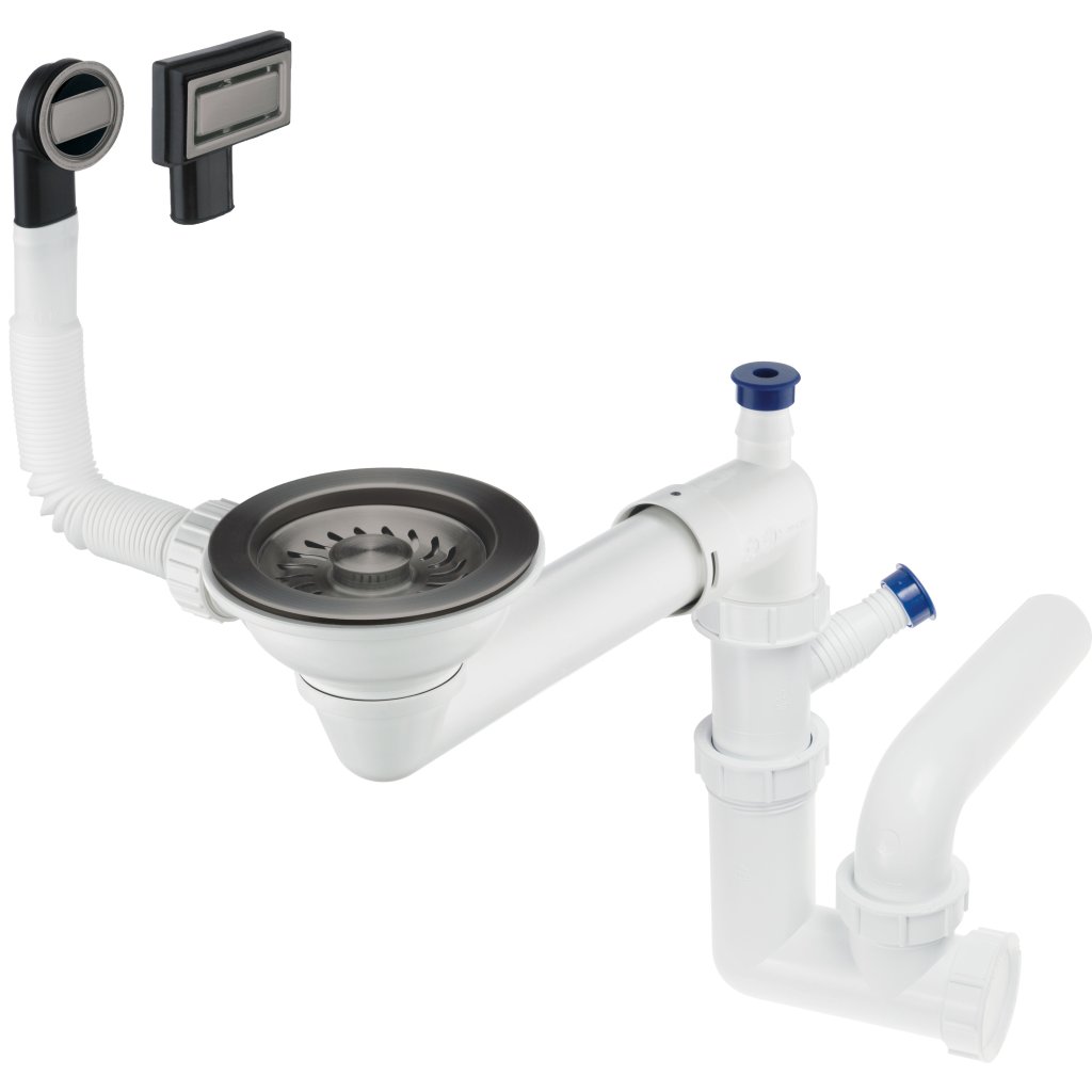 Dřez je vybaven inovativním sifonem "Space Saver". Pokud vás trápily trubky a kolena zabírající veškerý prostor ve skříni, je to pro vás řešení. Speciální design a teleskopická konstrukce umožňují přizpůsobit tvar sifonu vašim potřebám. Díky tomu lze ve skříni snadno vytvořit mnohem více prostoru, který lze využít pro domácí zavařeniny nebo koše na třídění odpadu. K sifonu je možné připojit i pračku nebo myčku. A hlavně - sifon je součástí sady!