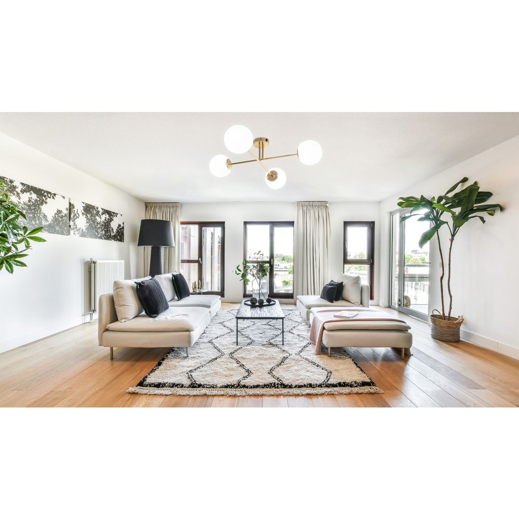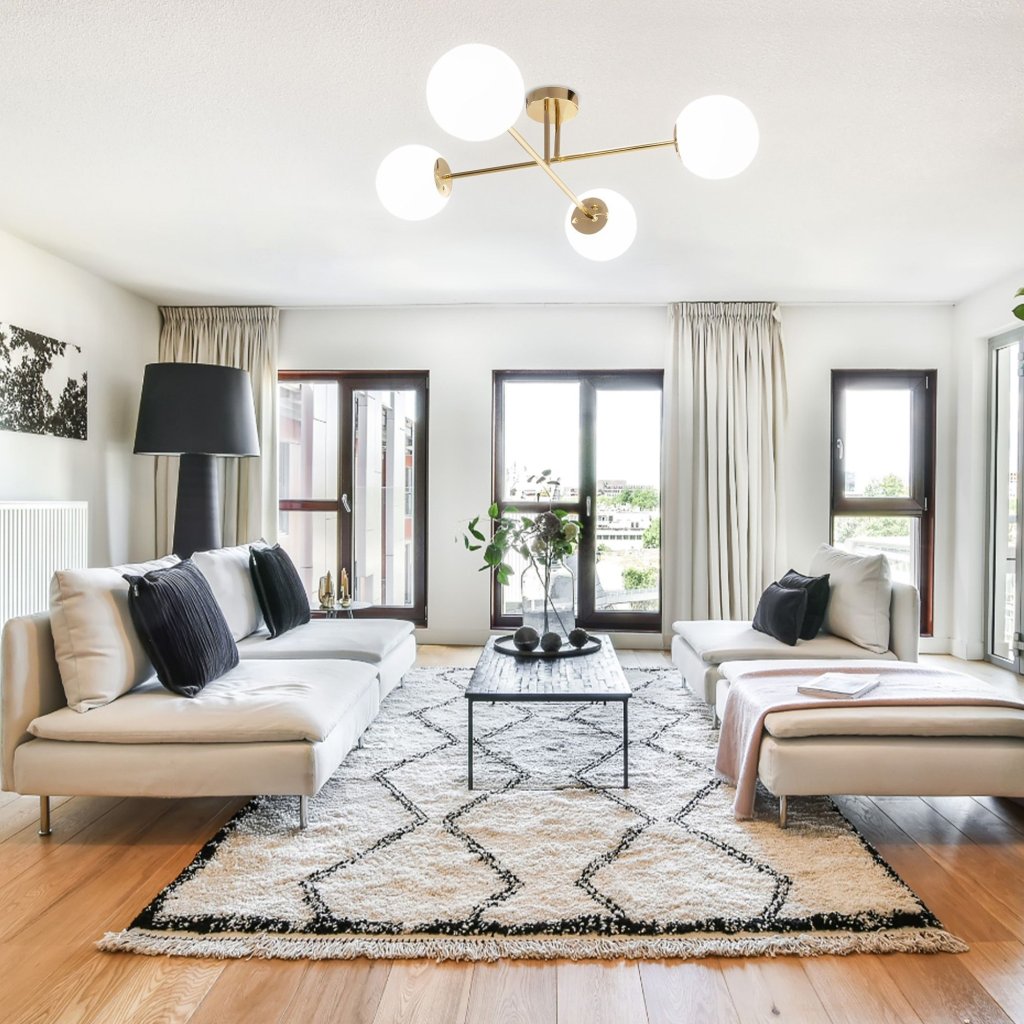 Lampa má až 4 světelných bodů, které jsou připevněny ke kovovým ramenům ve tvaru půlkruhů. Díky tomuto řešení koule dokonale rozptylují světlo po celé místnosti.