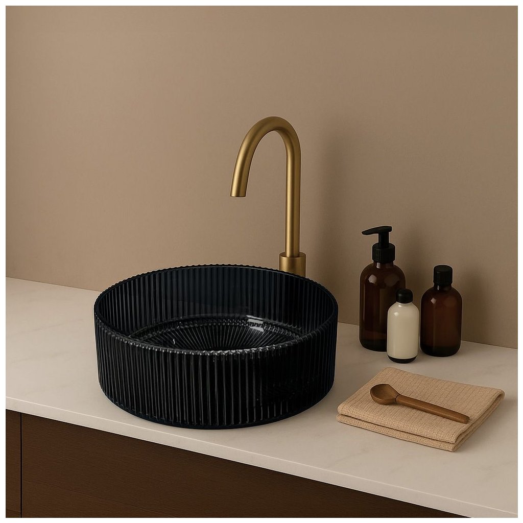 Deskové umyvadlo Ingrid 36 je ideální volbou pro ty, kteří hledají elegantní a originální řešení pro svou koupelnu.Je vyrobeno z vysoce kvalitního skla a zaujme rýhovaným povrchem a černou barvou, která interiéru dodává jedinečný charakter a luxusní styl.