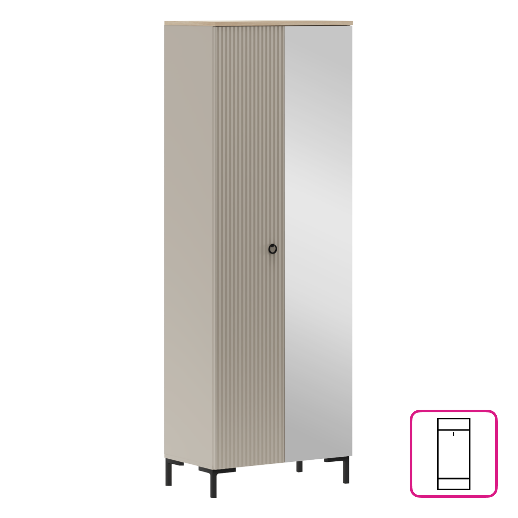 Vnitřní uspořádání je navrženo s maximálním ohledem na přehlednost a efektivní využití prostoru. Díky kombinaci policového systému a výsuvné věšákové tyče získáte variabilní úložné prostory pro vaše oblečení i doplňky. Velké zrcadlo na přední straně nejen opticky zvětší a prosvětlí místnost, ale zároveň slouží jako nepostradatelný pomocník při každodenní úpravě zevnějšku.