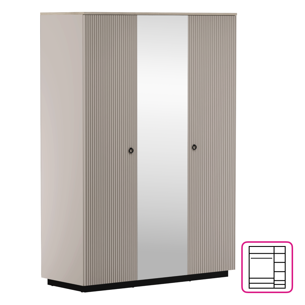Vnitřní uspořádání skříně je navrženo s maximálním důrazem na praktičnost a přehlednost. Nabízí kombinaci policové části a věšákové tyče, což umožňuje pohodlné uložení skládaného oblečení i dlouhých kabátů. Dvě integrované zásuvky jsou ideální pro drobné doplňky a prádlo, zatímco velké zrcadlo na prostředních dveřích opticky zvětší a prosvětlí celou místnost.
