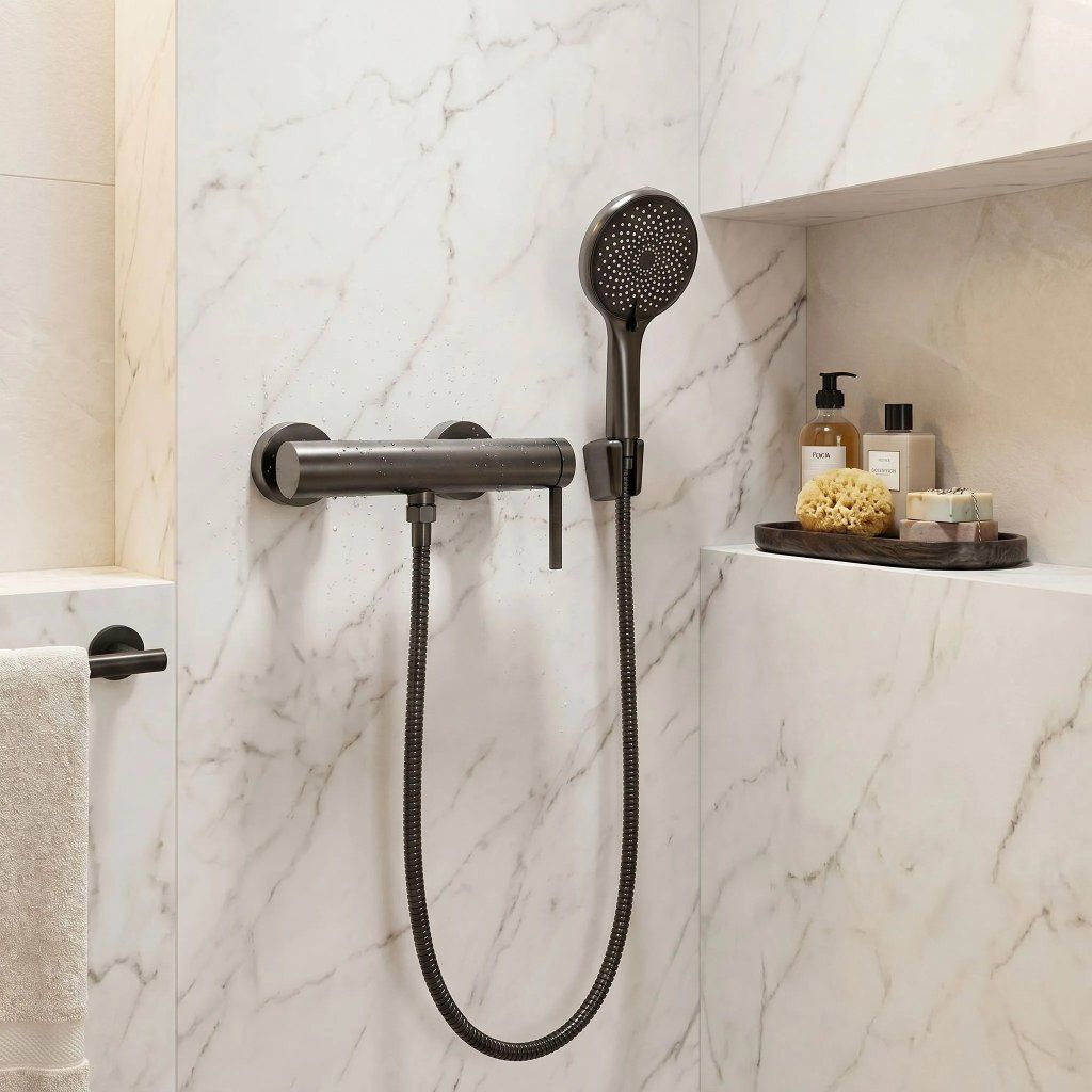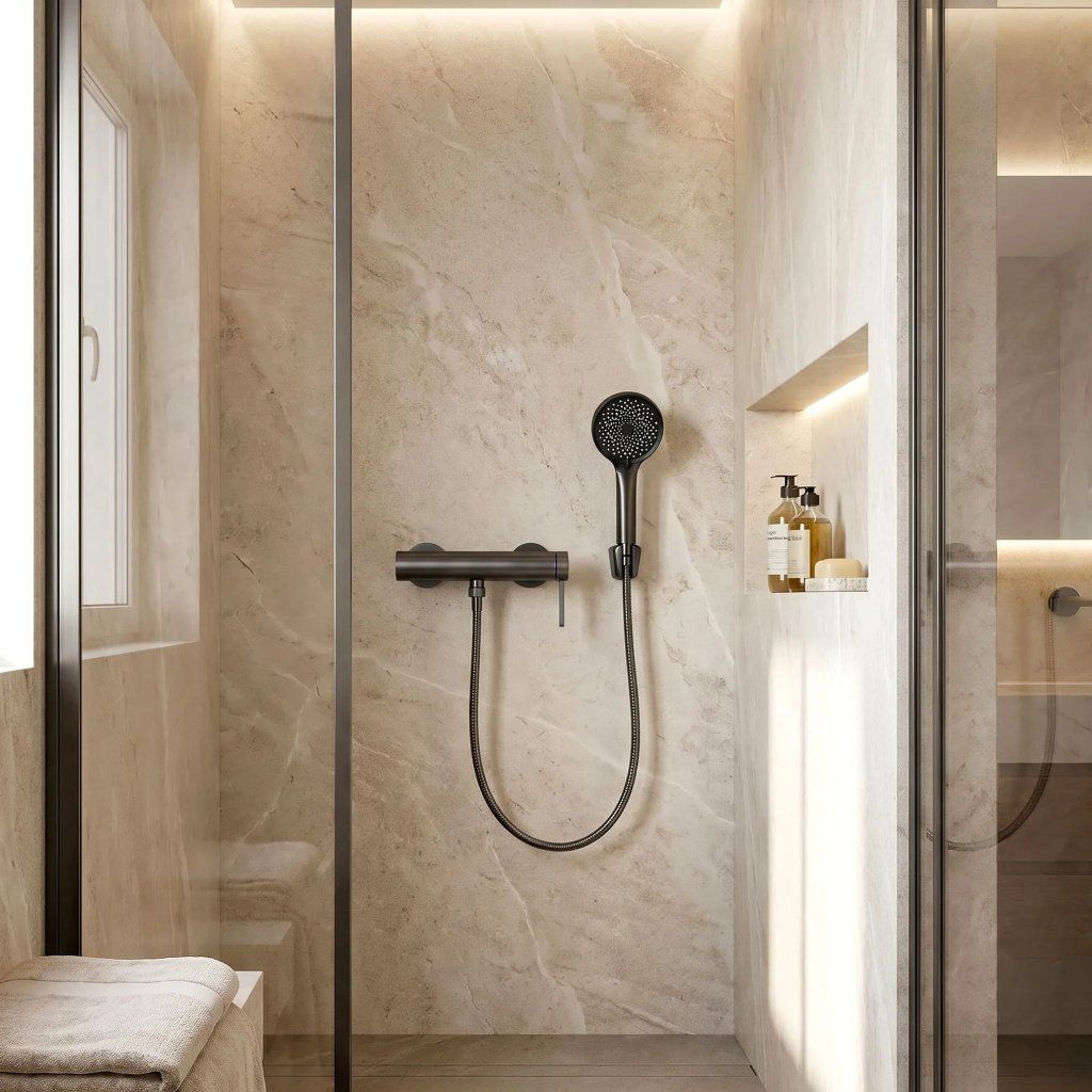 Sprchová baterie Rea Rivo v odstínu titan mat je navržena pro ty, kteří hledají do své koupelny vybavení prémiové třídy. Její minimalistický, a přesto vytříbený design s broušeným povrchem dodává sprchovému koutu nádech industriálního luxusu. Tělo baterie je vyrobeno z kvalitní a masivní mosazi, což zajišťuje její dlouhodobou stabilitu a odolnost vůči tlaku vody. Použitá technologie PVD (Physical Vapour Deposition) vytváří extrémně tvrdý povrch, který set chrání před mechanickým poškozením a chemickými vlivy.
