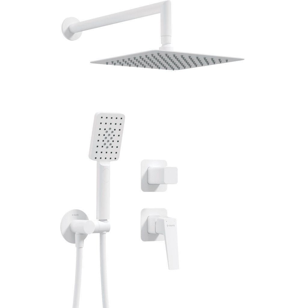 Elegantní podomítkový set s matným černým povrchem skládající se z hlavové sprchy s nastavitelným úhlem sklonu, ruční sprchy s hadicí a úhlovým stěnovým vývodem a pákové směšovací baterie s přepínačem funkcí. Čtvercová sprchová hlavice poskytuje rovnoměrný a pohodlný proud vody a zaručuje relaxační zážitek z koupání. Sada je vyrobena z vysoce kvalitních materiálů odolných vůči opotřebení a korozi. Sada je dále vybavena podomítkovou baterií s ergonomickou pákou, která umožňuje přesnou regulaci teploty a intenzity proudu vody a přepínačem funkcí. Matný černý povrch dodává nejen eleganci, ale také se snadno čistí. Minimalistický design skrývá montážní prvky a dodává koupelně moderní a úhledný charakter.