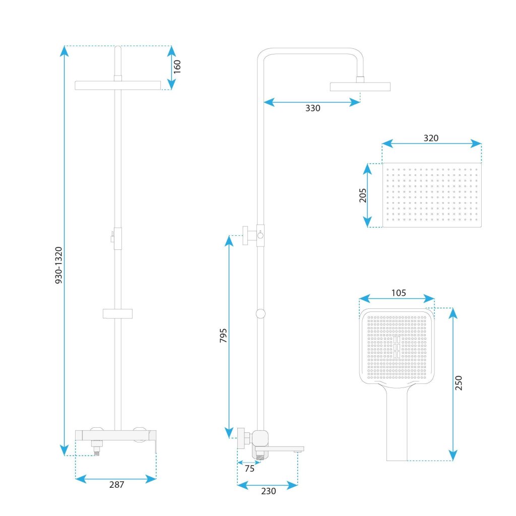 Obdélníková hlavová sprcha i ruční sprcha z lehkého a odolného ABS materiálu podtrhují moderní geometrický styl. Silikonové trysky se systémem Anti-Calc zabraňují usazování vodního kamene. Tyč setu je výškově nastavitelná (930–1320 mm), takže se přizpůsobí výšce stropu i postavě uživatele.