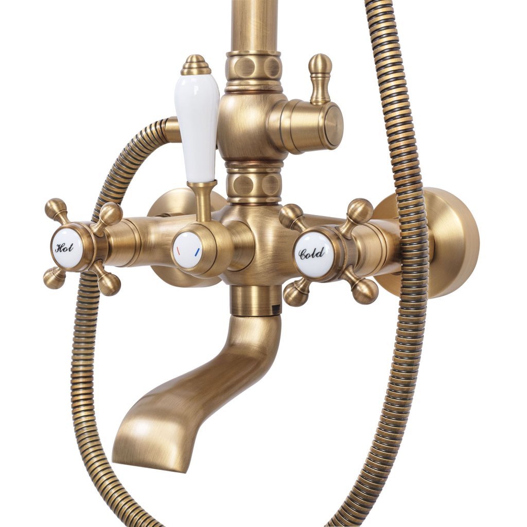 Moderní sprchová sada neobyčejných tvarů obsahuje baterii, vyrobenou z mosazi vysoké kvality v lakovaném provedení.