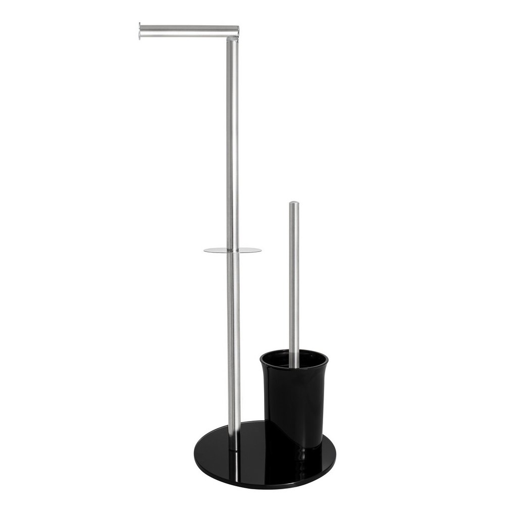 Stojan na toaletní papír se štětkou a místem pro náhradní roli papíru. Má černou základnu a černou nádobku, která mu dodává moderní vzhled.