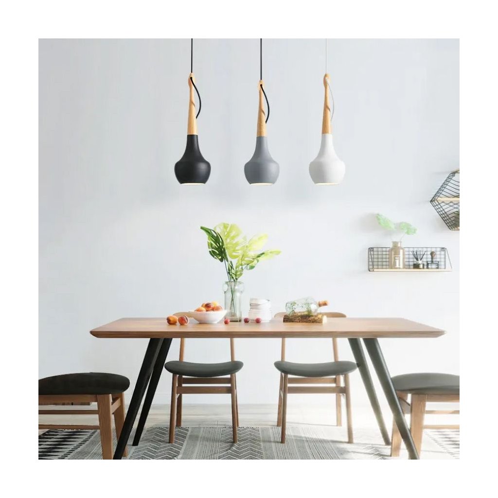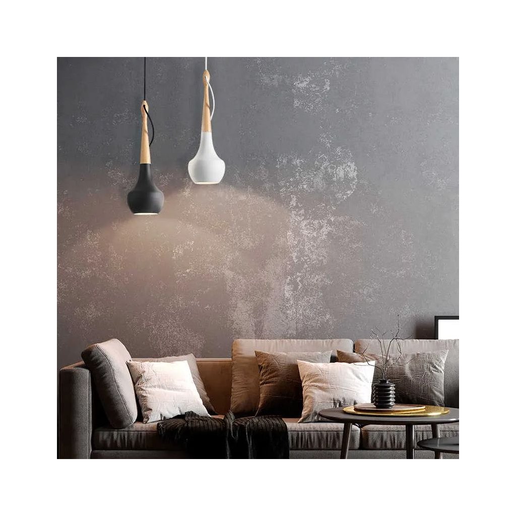 Závěsné svítidlo z kovu a dřeva s krytkou u stropu.Lampa má nejoblíbenější závit pro žárovky E27.