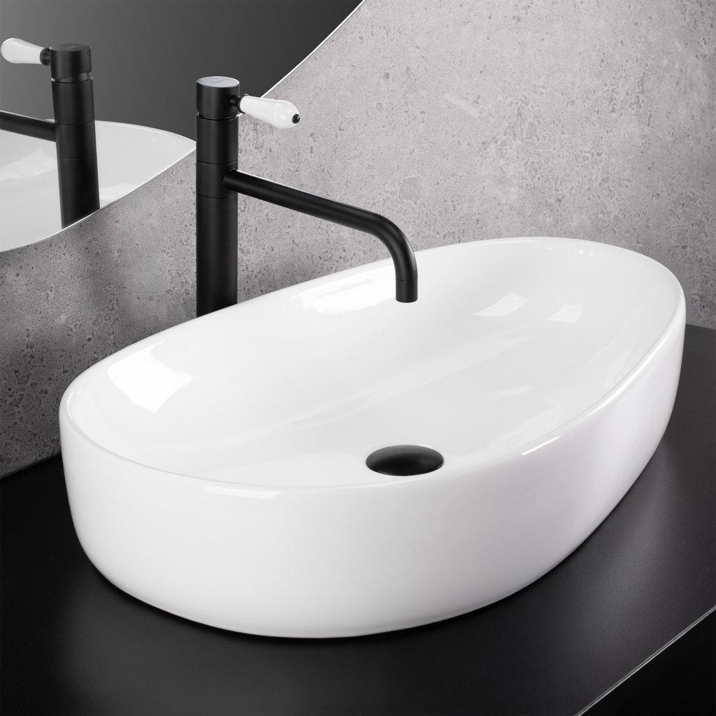 Model Sandra je určen pro montáž přímo na desku, což umožňuje úsporu místa a větší volnost při navrhování interiéru. Zajímavý tvar nepravidelné kapky dodává celku jemný, ale výrazný vizuální akcent, který se hodí do moderních, elegantních i přírodně laděných koupelen.