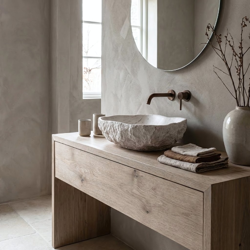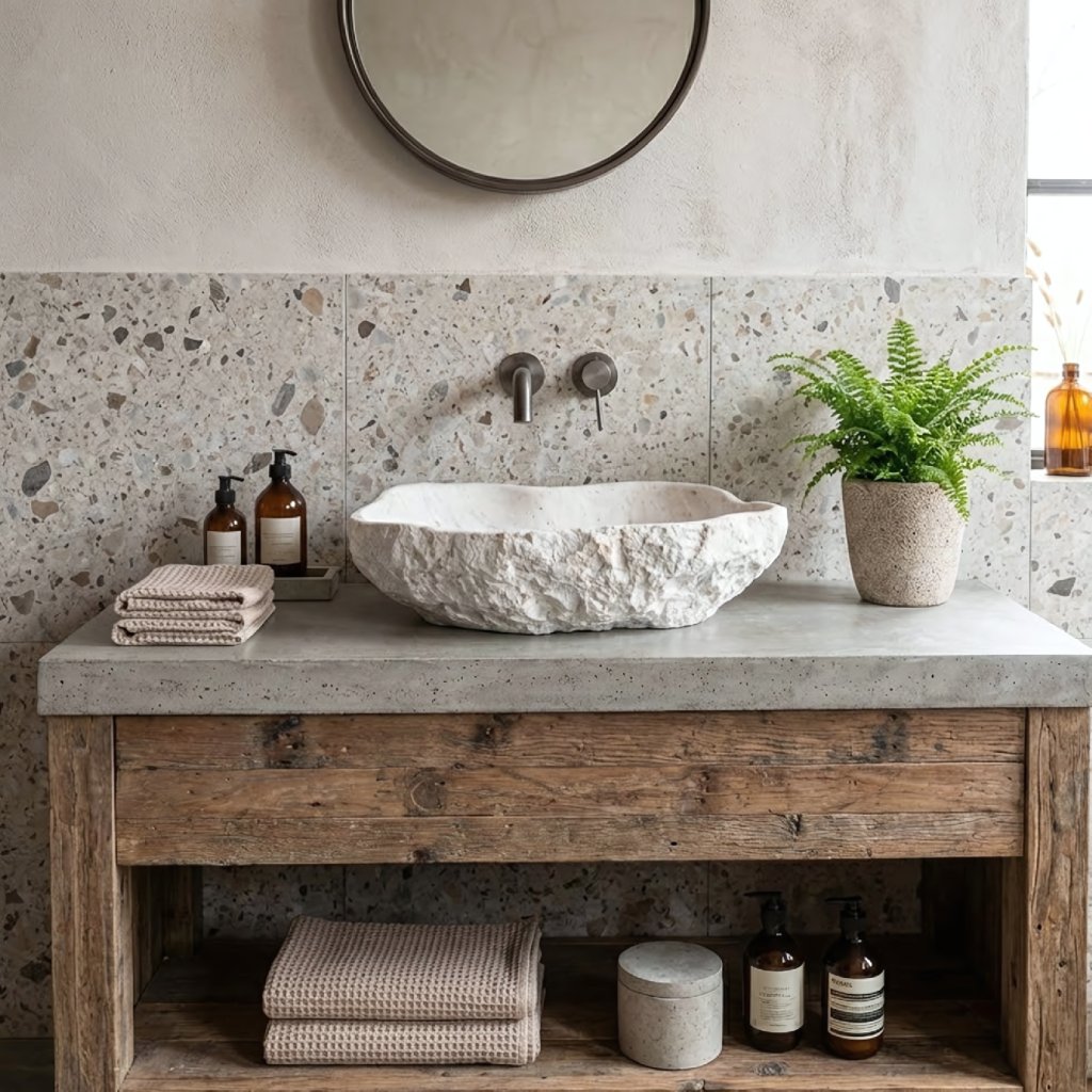 Umyvadlo je vyrobeno z pokročilého kompozitu (umělého kamene). Tento materiál spojuje estetiku přírodního kamene s technickými výhodami moderních hmot – je extrémně odolný vůči mechanickému poškození, neporézní a na dotek působí tepleji a příjemněji než studený kámen.