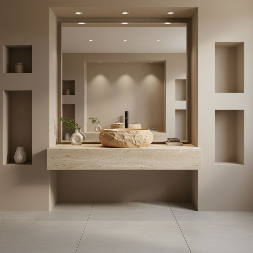 Design umyvadla je postaven na efektním kontrastu povrchů. Zatímco zvenčí působí umyvadlo jako ručně opracovaný kus skály s autentickou texturou, vnitřní prostor mísy je precizně vyleštěný a hladký. To zajišťuje nejen vysoký hygienický standard a snadný odtok vody, ale také velmi snadné čištění, které by u hrubého kamene bylo obtížné.