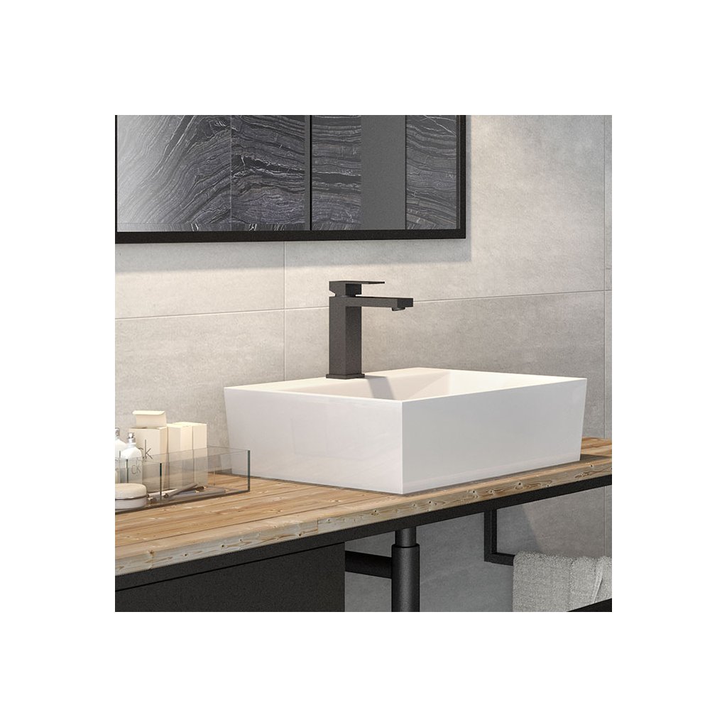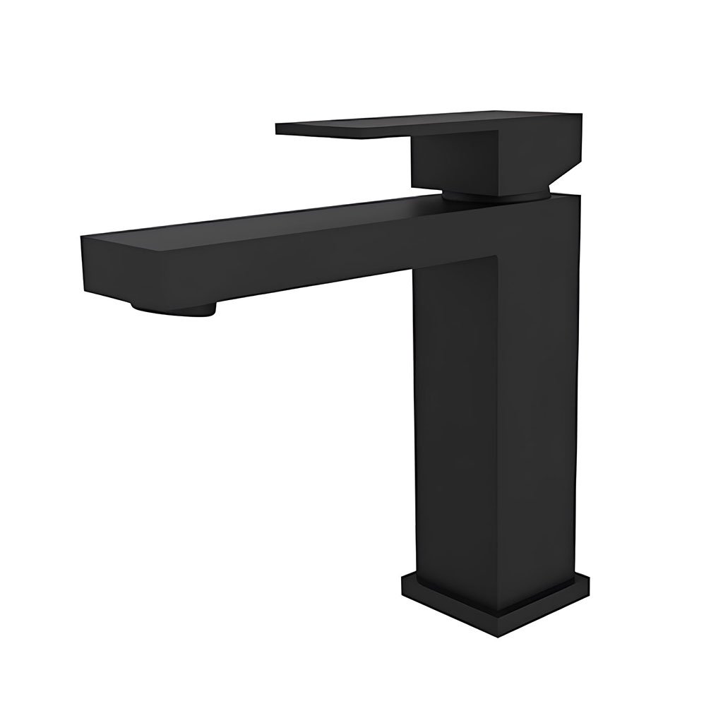Nízká umyvadlová stojánková baterie s pákovým ovládáním v povrchové úpravě černá mat. Baterie je vybavena pevným výtokovým ramínkem s perlátorem.