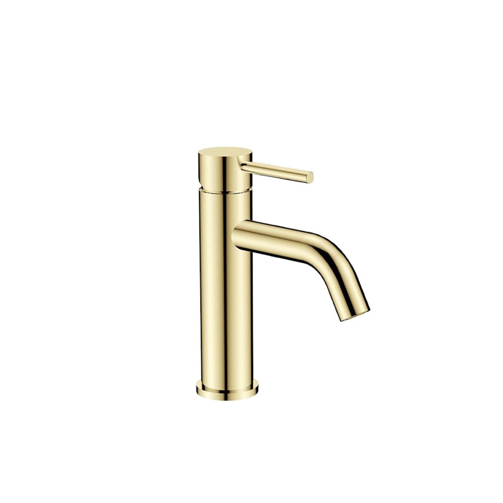 Umyvadlová stojánková baterie s pákovým ovládáním ve světle zlaté lesklé povrchové úpravě. Baterie je vybavena pevným výtokovým ramínkem s perlátorem.