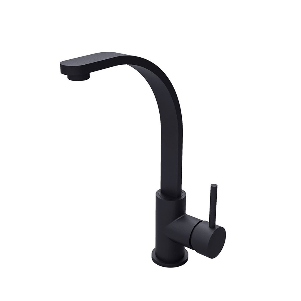Vysoká umyvadlová stojánková baterie s pákovým ovládáním v povrchové úpravě černá mat. Baterie je vybavena otočným výtokovým ramínkem s perlátorem.