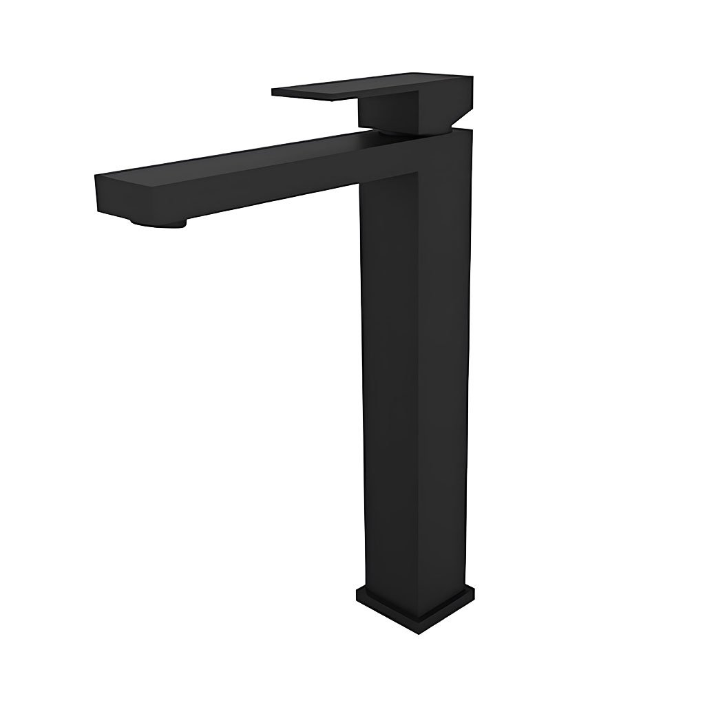 Vysoká umyvadlová stojánková baterie s pákovým ovládáním v povrchové úpravě černá mat. Baterie je vybavena pevným výtokovým ramínkem s perlátorem.