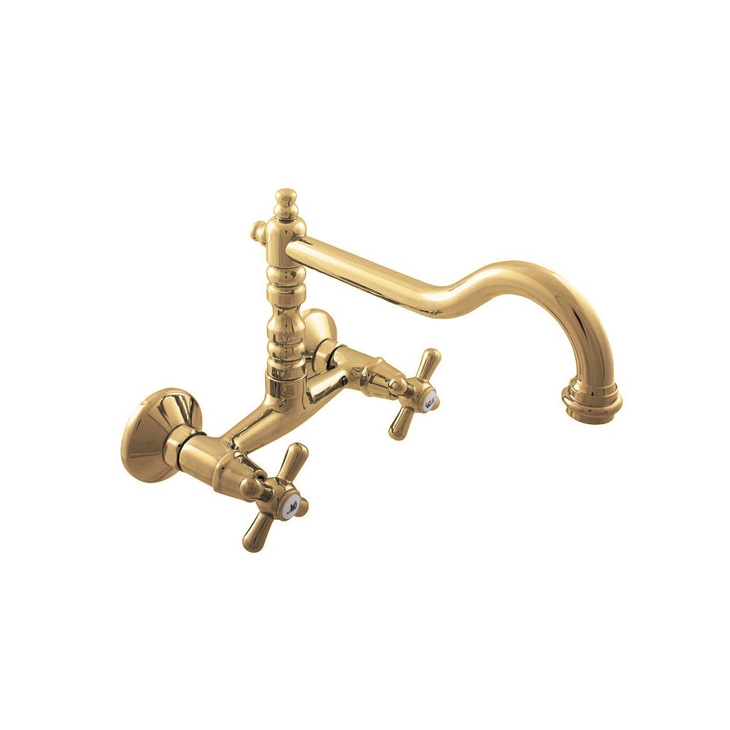 Vodovodní baterie dřezová nástěnná s kulatým otočným ramínkem.
