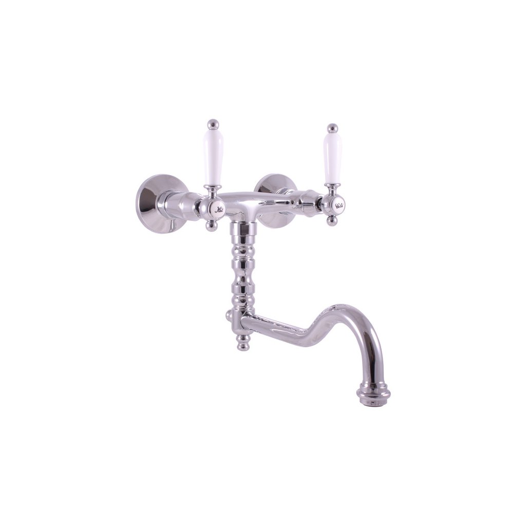 Vodovodní baterie dřezová nástěnná s kulatým otočným ramínkem.