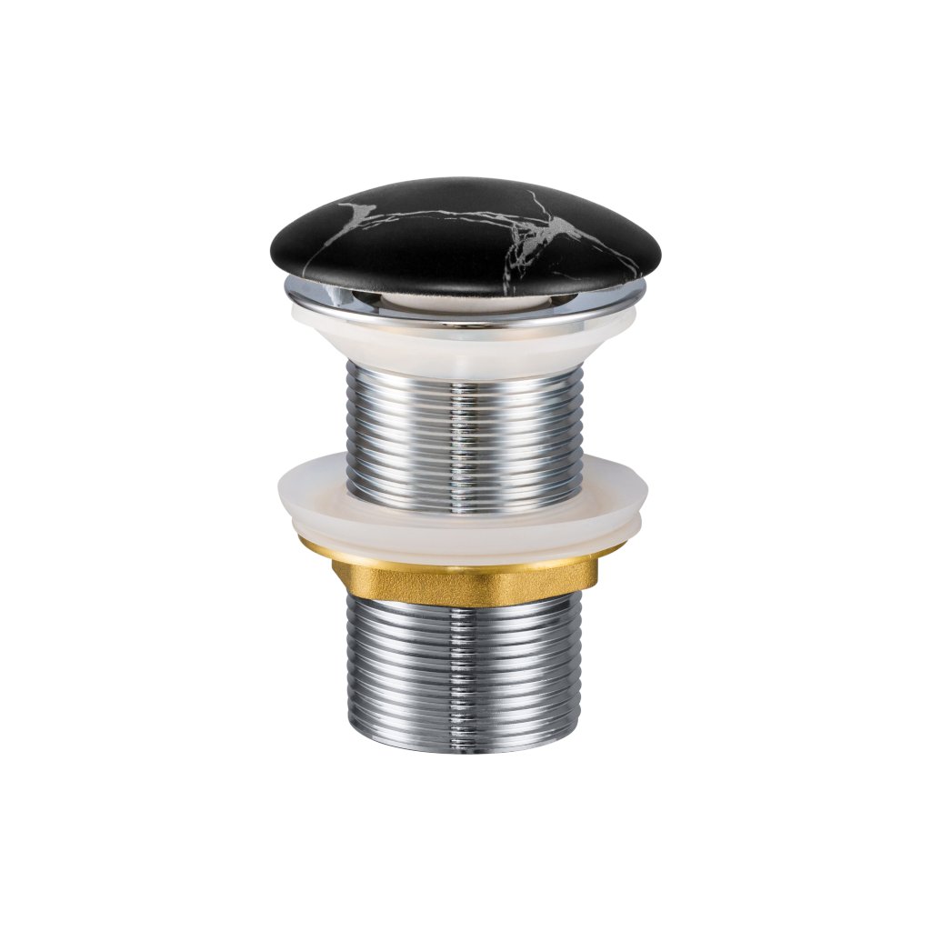 Tato umyvadlová výpusť je speciálně navržena pro umyvadla bez přepadu, což ji činí ideální volbou pro designová desková umyvadla a moderní nábytkové modely. Horní krytka je vyrobena z prvotřídní keramiky v matném černém mramorovém dekoru, který plynule doplňuje tmavá nebo kontrastní světlá umyvadla a vytváří tak celistvý a ničím nerušený vzhled. Použitý materiál je vysoce odolný proti usazování nečistot i běžnému mechanickému opotřebení, přičemž vnitřní kovový mechanismus zaručuje spolehlivou funkčnost systému Click-Clack po mnoho let.