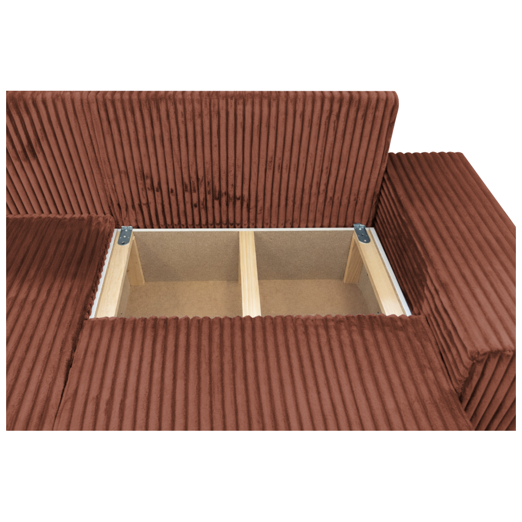 Tento model vyniká svou vysokou odolností a kvalitním zpracováním, které zaručuje dlouhou životnost i při každodenním používání. Sedací souprava je vybavena praktickým úložným prostorem, kam snadno schováte lůžkoviny nebo sezónní věci. Pohodlné polštáře a kvalitní výplň z PUR pěny zajišťují maximální komfort během relaxace, zatímco elegantní černé nožičky dodávají celému kusu nábytku lehkost a stabilitu.