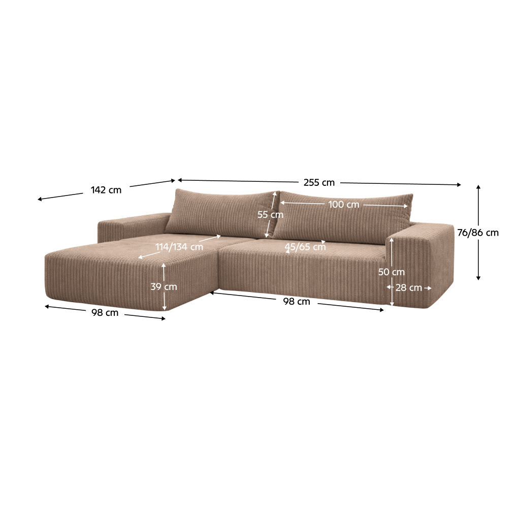 Tato rohová souprava vyniká svou praktičností a variabilitou. Nabízí velkorysý prostor pro sezení i relaxaci, přičemž pohodlí zvyšují měkké polštáře a kvalitní výplň z pur pěny. Konstrukce na decentních nožičkách usnadňuje úklid pod nábytkem a dodává celému kompletu pocit lehkosti. Univerzální provedení umožňuje sestavit soupravu s rohem na pravé nebo levé straně podle dispozic vašeho pokoje.