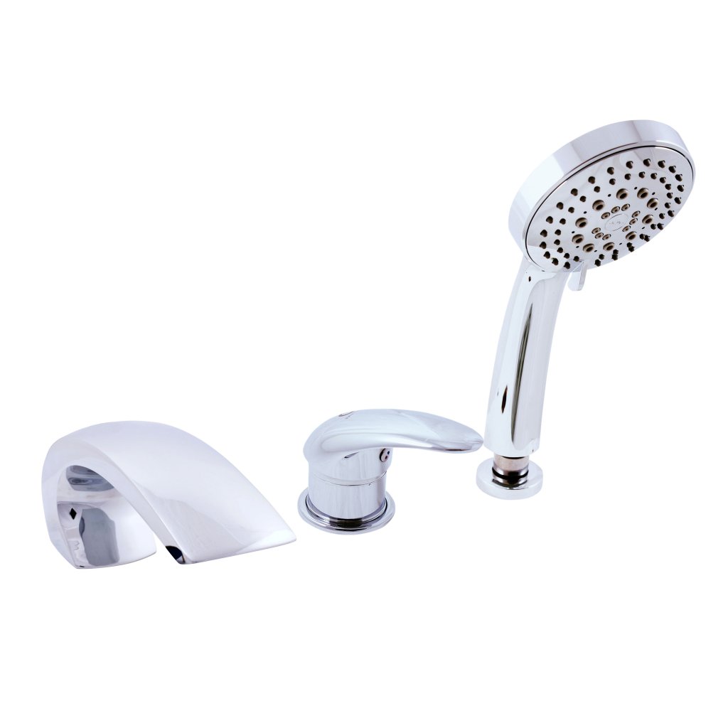 Vodovodní baterie vanová stojánková tříotvorová s přepínačem v mixu, samonavíjecí sprchou a 2m hadicí.