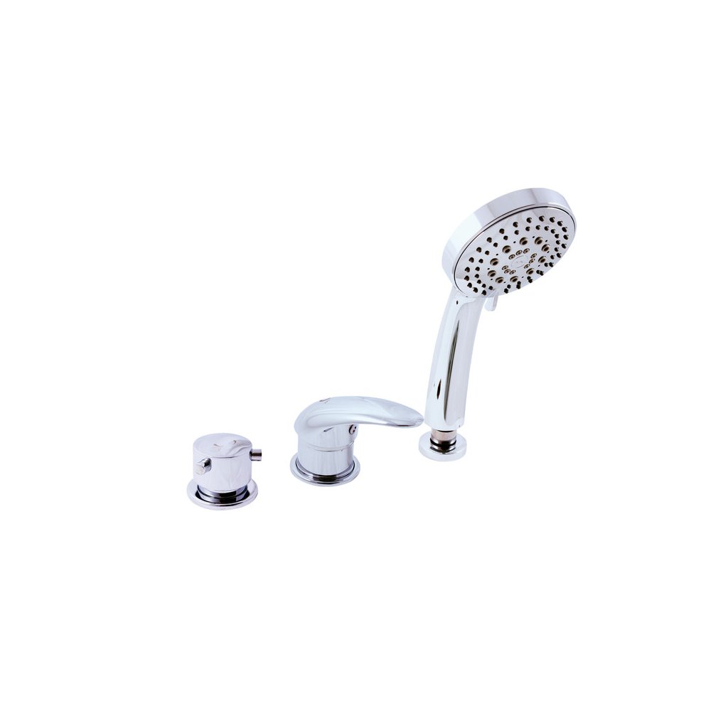 Vodovodní baterie vanová stojánková tříotvorová s keramickým přepínačem MD0448, samonavíjecí sprchou a 2m hadicí, pro napouštění přes přepad sifonu.