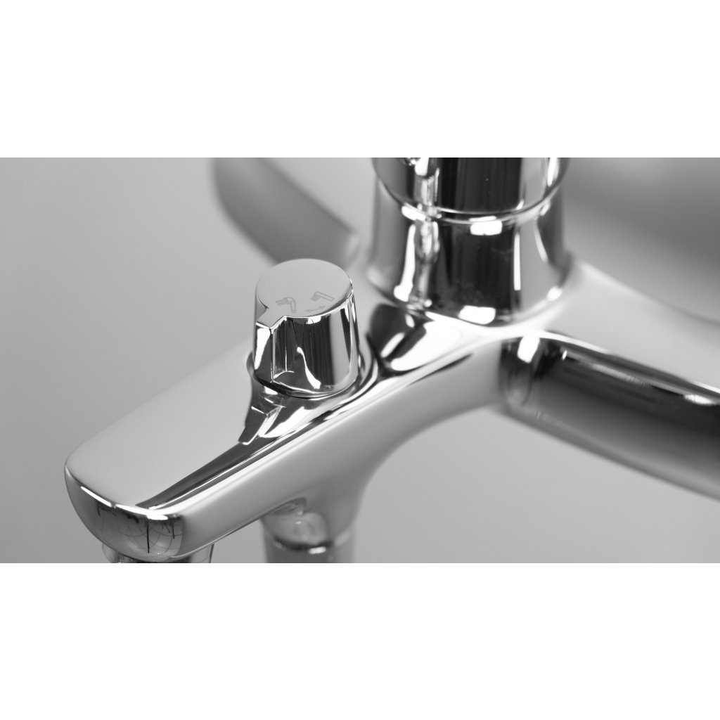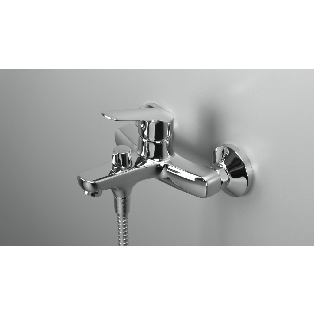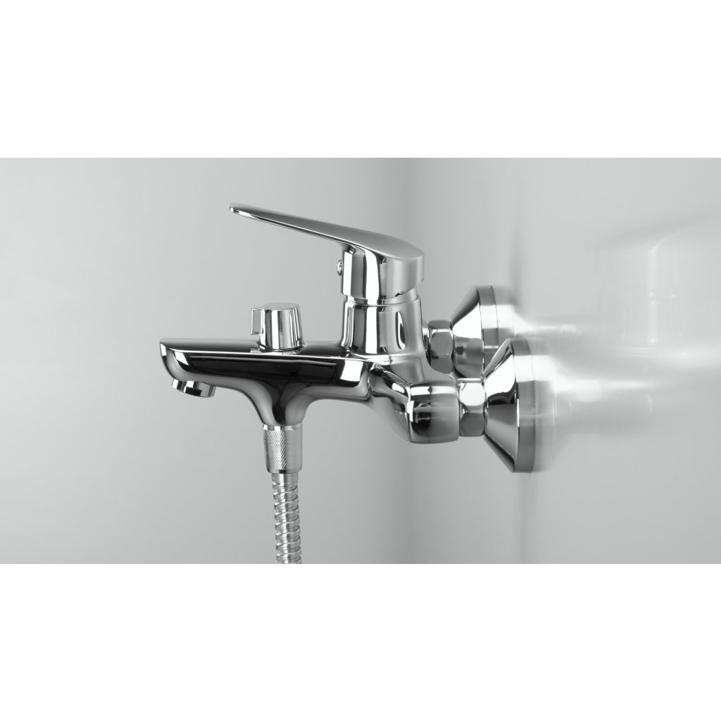 Moderní směšovací nástěnná vanová baterie. Baterie je vybavena zpětnými ventily, které zamezují vtékání již smíšené vody zpět do vodovodního řádu. Baterie má přepínač pro klasický výtok či sprchu.Baterie je vybavena proudovým perlátorem