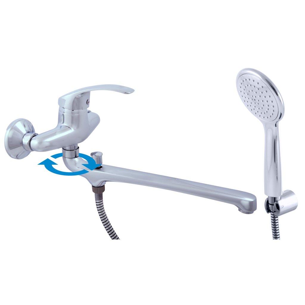 Vodovodní baterie pro vanu a umyvadlo nástěnná s plochým ramínkem, sprchou a pevným držákem.