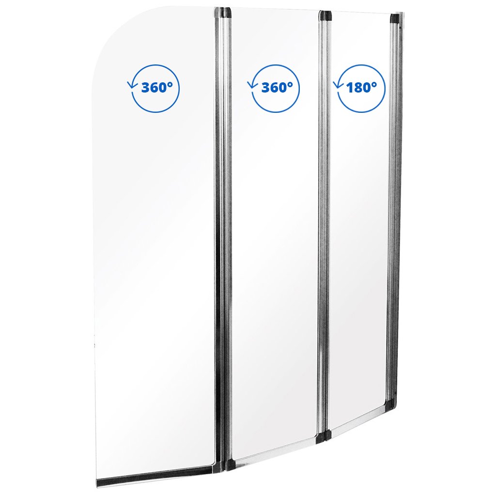 Vanová zástěna – pro příznivce sprchování ideální řešení v každé malé koupelně, kde není místo na umístění sprchového koutu. Vanovou zástěnu nabízíme v rozměrech 123,5 x 139 cm. Svislé stěny vanových zástěn jsou vyrobeny z tvrzeného bezpečnostního skla.- 3-dílná vanová zástěna- univerzální pravo/levé provedení- rozsah otáčení pohyblivé části 360°
